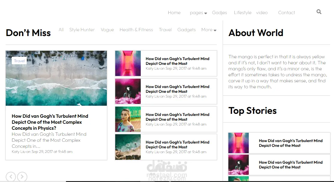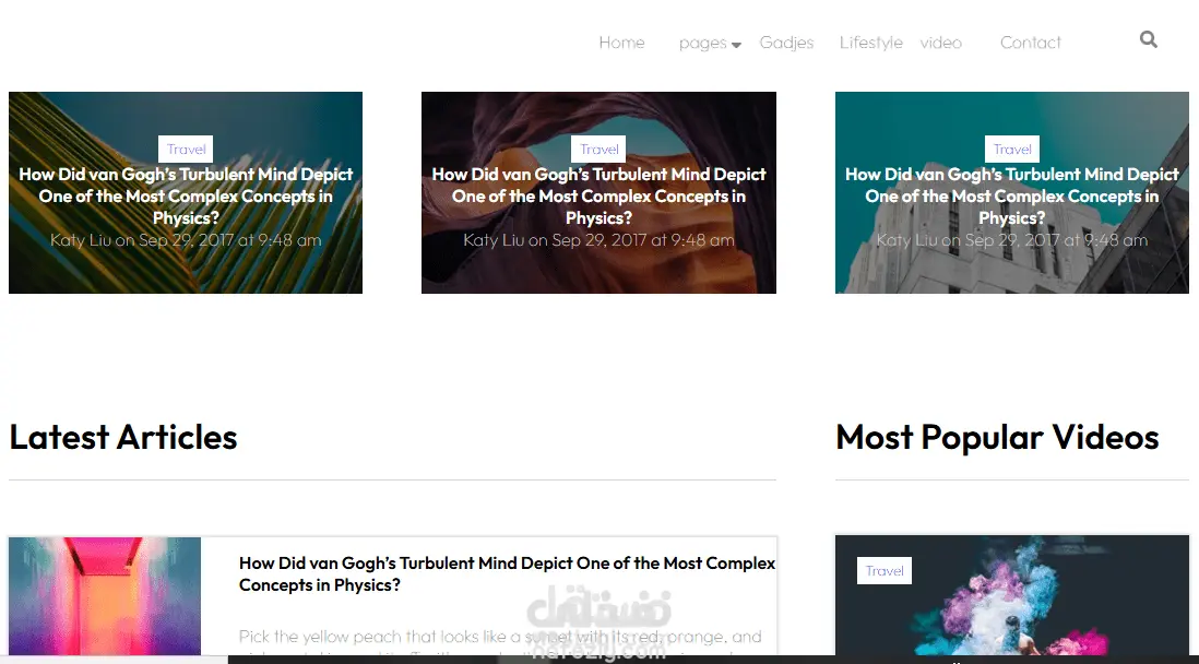 المميزات: تنظيم المقالات في شبكات (Grids) مختلفة، قسم خاص بالفيديوهات الأكثر رواجاً، وتصميم جانبي (Sidebar) لعرض أهم القصص.