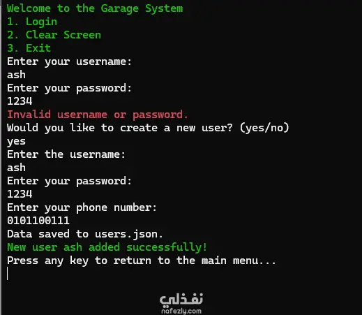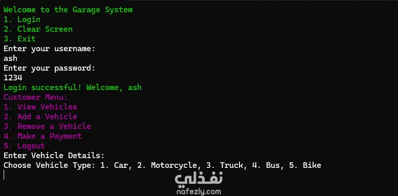 تطبيق "Console App" احترافي مصمم لإدارة عمليات الجراج بكفاءة، يركز على تنظيم بيانات المستخدمين والمركبات وتسهيل عمليات الدفع. المميزات التقنية: نظام إدارة المستخدمين: يدعم تسجيل مستخدمين جدد وحفظ بياناتهم في ملفات JSON لضمان استمرارية البيانات (Data Persistence). نظام تسجيل الدخول (Authentication): توفير بوابة دخول آمنة للمستخدمين المسجلين فقط. إدارة المركبات: إمكانية إضافة وحذف أنواع مختلفة من المركبات (سيارات، دراجات نارية، شاحنات، حافلات، دراجات). نظام المدفوعات: ميزة مدمجة لإتمام عمليات الدفع داخل النظام. تجربة المستخدم: واجهة كونسول منظمة وسهلة الاستخدام مع دعم تنظيف الشاشة (Clear Screen) والتنقل السلس بين القوائم. طريقة التنفيذ: تم بناء المنطق البرمجي باستخدام لغة #C ، مع معالجة البيانات باستخدام صيغة JSON.