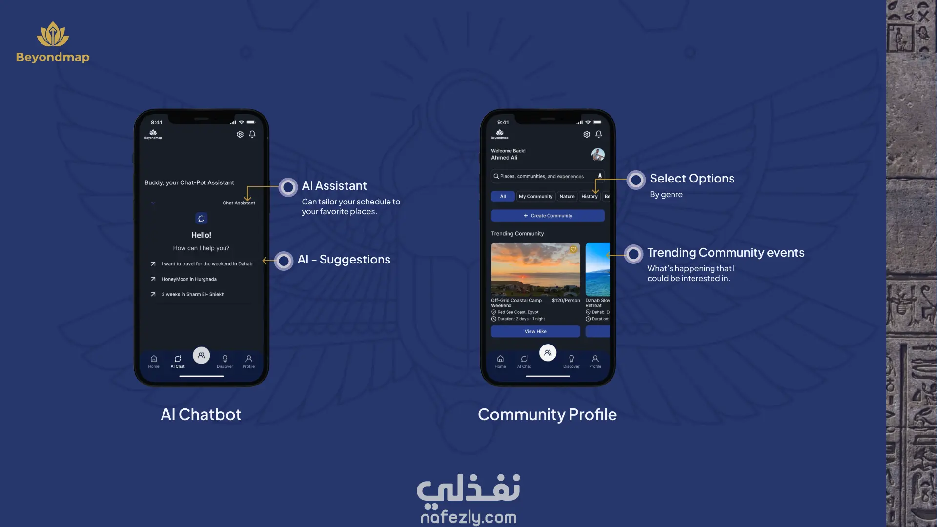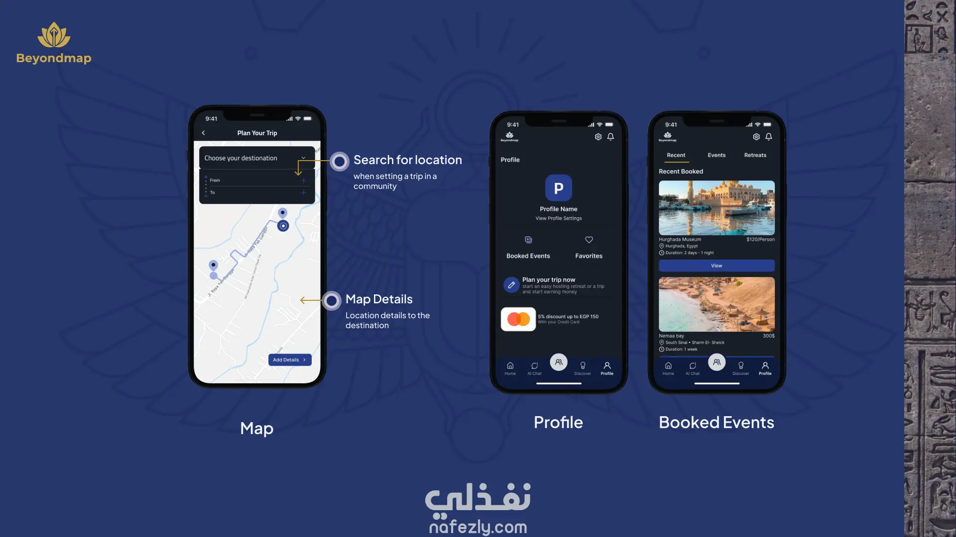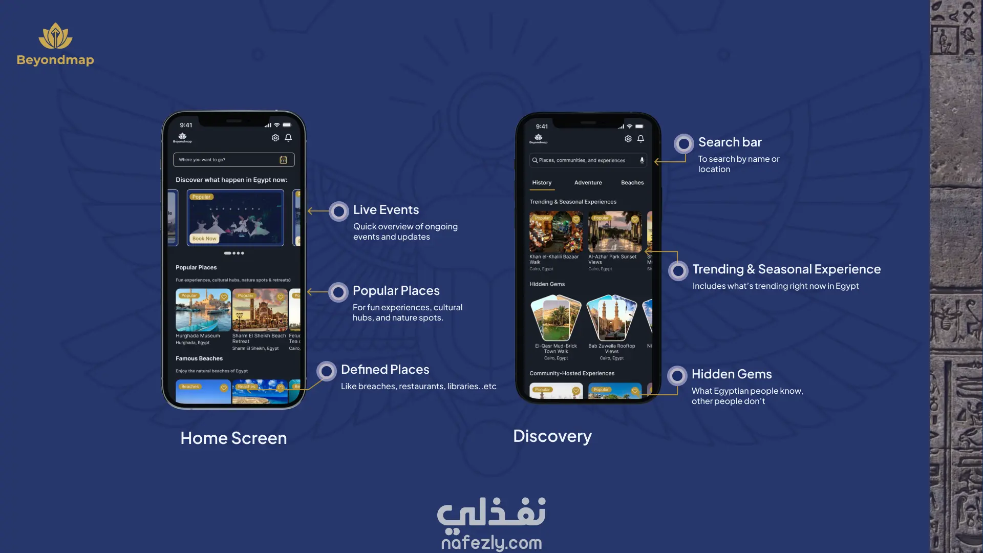 تصميم تجربة وواجهة مستخدم لتطبيق BeyondMap، وهو تطبيق مجتمعي يساعد المسافرين والسكان المحليين على اكتشاف أماكن وتجارب غير تقليدية في مصر بعيدًا عن المسارات السياحية المعتادة.