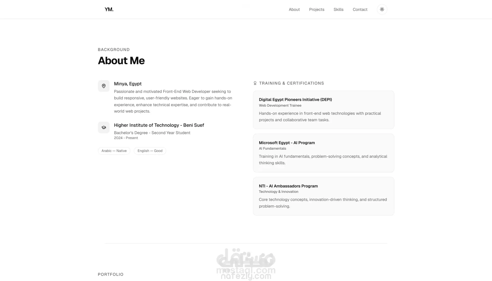 قمت بتطوير موقع شخصي احترافي لعرض الهوية الرقمية والخدمات ومعرض الأعمال، باستخدام Next.js لضمان أداء سريع وتحسين الظهور في محركات البحث (SEO)، وTailwind CSS لبناء واجهة حديثة ومتجاوبة تعمل بسلاسة على جميع الأجهزة.