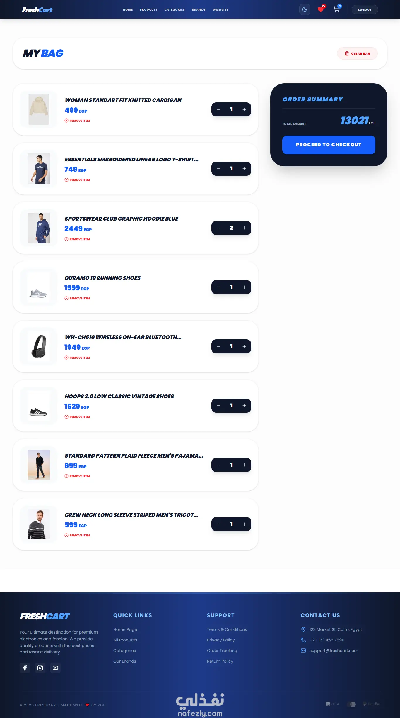 قمت بتطوير FreshCart، وهي منصة تجارة إلكترونية عصرية تم تصميمها لتقديم تجربة تسوق سلسة وسريعة. المشروع يركز على الأداء العالي وتجربة المستخدم (UX) وتوافق الموقع مع جميع الشاشات. أبرز المميزات التي تم تنفيذها: عرض المنتجات الديناميكي: سحب وعرض المنتجات من API خارجي مع دعم التصنيفات (Categories) والبراندات. نظام تسوق متكامل: عربة تسوق (Cart) تعمل بكفاءة مع إمكانية إضافة وحذف وتعديل المنتجات. واجهة مستخدم عصرية: تصميم Responsive بالكامل يعمل على الموبايل والتابلت والـ Desktop بامتياز. الأداء السريع: استخدام تقنيات الـ Caching لضمان سرعة تحميل المنتجات. الأمان والتحقق: نظام تسجيل دخول وحماية للمسارات (Route Guards). التقنيات المستخدمة (Tech Stack): Framework: React.js / Next.js Styling: Tailwind CSS (للتصميم العصري والسريع) State Management: (مثل Redux Toolkit أو Context API) لضمان مزامنة البيانات. Data Fetching: Axios & React Query (لضمان استقرار سحب البيانات). Components: استخدام مكتبات متطورة مثل Flowbite أو Headless UI