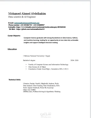 ما سأقدمه في هذه الخدمة: كتابة CV احترافي ومنظم بطريقة تجذب مسؤولي التوظيف. إبراز المهارات والخبرات بشكل واضح ومؤثر. تنسيق السيرة الذاتية بتصميم بسيط واحترافي. تحسين المحتوى ليكون مناسب لأنظمة ATS التي تستخدمها الشركات في فرز السير الذاتية. تسليم الملف بصيغة PDF أو Word لسهولة التعديل والاستخدام. أهتم بالتفاصيل لضمان أن تكون السيرة الذاتية قوية وتعكس خبراتك بشكل احترافي مما يزيد فرص قبولك في الوظائف.