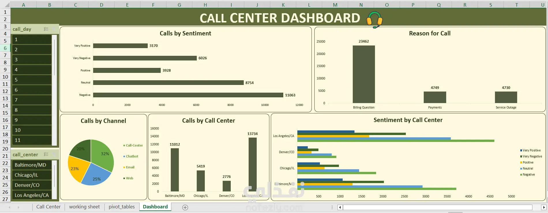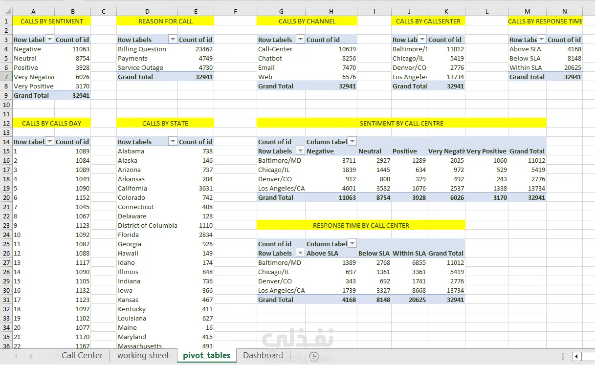 هذا المشروع يقوم بتحليل بيانات عمليات مراكز الاتصال لاستخراج رؤى حول تفاعلات العملاء، أداء الخدمة، وكفاءة العمليات التشغيلية. باستخدام برنامج Excel وPivot Tables تم استكشاف البيانات لاكتشاف الأنماط المتعلقة بمشاعر العملاء، أسباب الاتصال، أداء زمن الاستجابة، وتوزيع عبء العمل بين مراكز الاتصال المختلفة. النتيجة النهائية للمشروع هي لوحة معلومات (Dashboard) تعرض أهم مؤشرات الأداء الرئيسية (KPIs) والرؤى التشغيلية بشكل واضح وسهل الفهم. تحتوي مجموعة البيانات على معلومات عن مكالمات دعم العملاء، وتشمل: اسم العميل مشاعر العميل (سلبي، محايد، إيجابي) درجة رضا العميل (CSAT Score) تاريخ ووقت المكالمة سبب الاتصال المدينة والولاية قناة التواصل (مركز الاتصال، روبوت المحادثة، البريد الإلكتروني، الويب) زمن الاستجابة وفق اتفاقية مستوى الخدمة (SLA) مدة المكالمة موقع مركز الاتصال يركز التحليل في هذا المشروع على الإجابة عن مجموعة من الأسئلة التجارية المهمة، مثل: ما هي أكثر الأسباب شيوعًا التي تدفع العملاء للتواصل مع الدعم؟ كيف يتوزع شعور العملاء تجاه الخدمة؟ ما هي قناة الدعم الأكثر استخدامًا من قبل العملاء؟ أي مركز اتصال يستقبل أكبر عدد من المكالمات؟ هل يتم الالتزام بأهداف زمن الاستجابة المحددة في اتفاقية مستوى الخدمة (SLA)؟ أي المواقع الجغرافية تولد أكبر عدد من طلبات الدعم؟