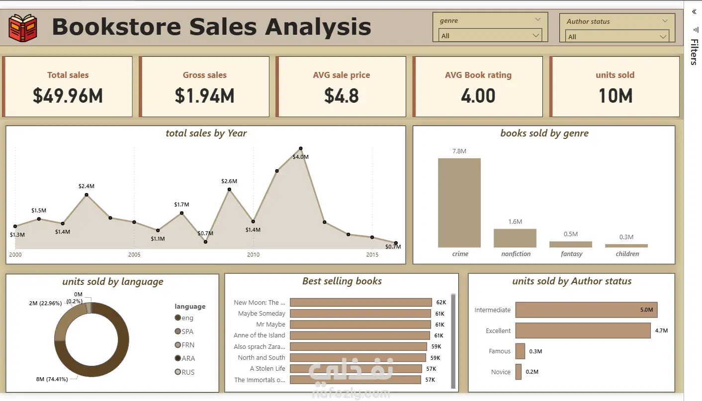 هدف العام: تتبع وتقييم الأداء المالي وحركة المبيعات لمتجر كتب. المؤشرات الرئيسية (KPIs): يبرز إجمالي المبيعات (حوالي 50 مليون دولار)، إجمالي الوحدات المباعة (10 ملايين وحدة)، متوسط سعر البيع، ومتوسط تقييمات الكتب. التحليلات المرئية: يوضح اتجاه المبيعات الزمنية عبر السنوات، ويحلل المبيعات بناءً على تصنيف الكتب (مثل الجريمة أو الكتب الواقعية)، واللغات الأكثر مبيعاً، بالإضافة إلى تسليط الضوء على أفضل الكتب مبيعاً وتأثير شهرة المؤلف على حجم المبيعات.