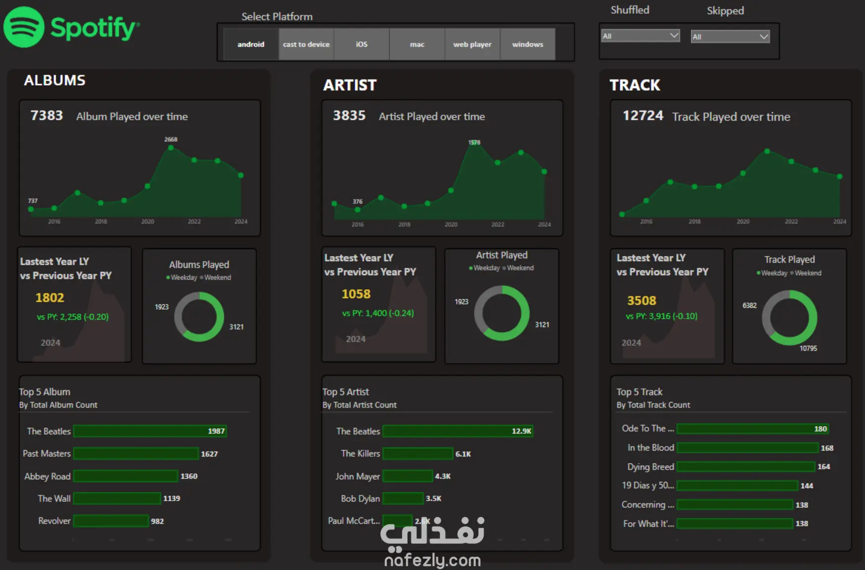 الهدف العام: تحليل أنماط ونشاط الاستماع للموسيقى على منصة Spotify عبر فترات زمنية مختلفة. المؤشرات الرئيسية (KPIs): يتبع إجمالي عدد الألبومات، الفنانين، والمقاطع الصوتية التي تم الاستماع إليها. التحليلات المرئية: ينقسم التصميم إلى ثلاثة أعمدة رئيسية (الألبومات، الفنانين، المقاطع). يقدم مقارنات واضحة بين أداء العام الحالي والعام السابق (LY vs PY)، ويقارن بين معدلات الاستماع في أيام العمل العادية وعطلات نهاية الأسبوع، كما يعرض قوائم "أفضل 5" لكل فئة (مثل تصدر فرقة The Beatles).