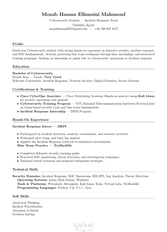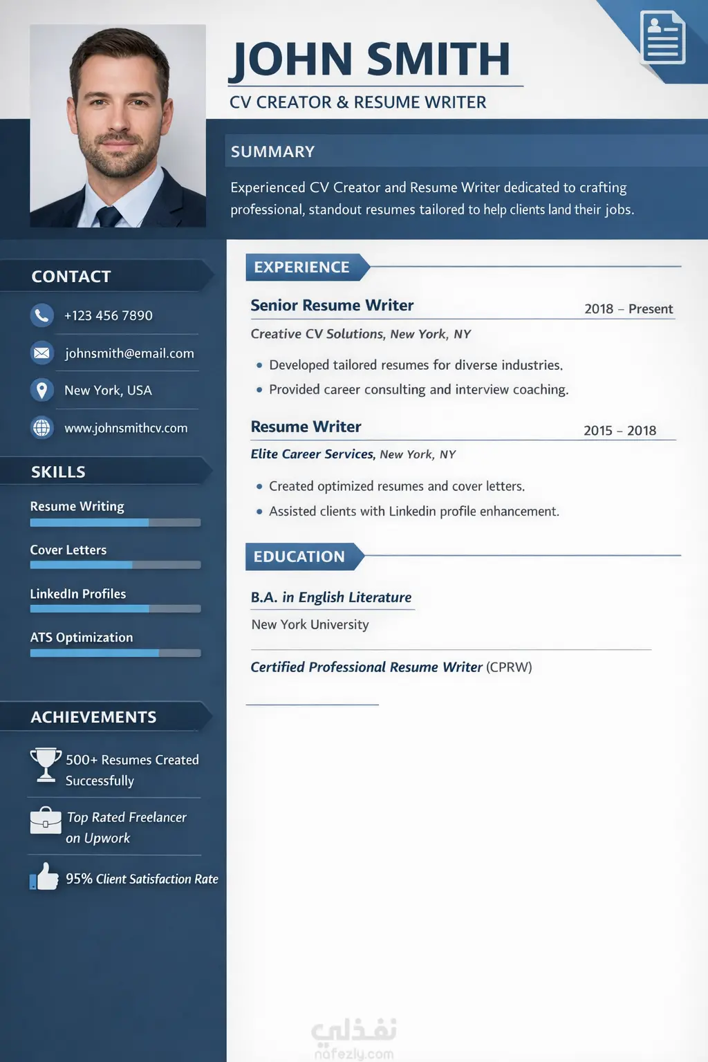 قمت بتصميم نموذج سيرة ذاتية احترافي وحديث مناسب للتقديم على الوظائف والمنصات المهنية. يتميز التصميم بتنظيم واضح للأقسام مثل المعلومات الشخصية، الخبرات العملية، المهارات، التعليم، والإنجازات، مع استخدام ألوان احترافية وتنسيق يسهل قراءته من قبل مسؤولي التوظيف وأنظمة ATS. يمكن تعديل السيرة الذاتية بسهولة وإضافة البيانات الخاصة بكل عميل حسب المجال الوظيفي. يدعم التصميم التصدير بصيغ متعددة مثل PDF أو Word ليكون جاهزًا للتقديم مباشرة.
