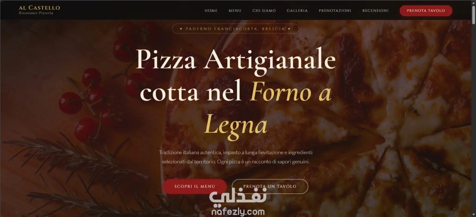هذا المشروع عبارة عن موقع ويب احترافي متكامل قمت بتصميمه وتطويره لمطعم إيطالي راقٍ يحمل اسم "Ristorante Pizzeria al Castello" . يتميز الموقع بتصميم فاخر وعصري مستوحى من الهوية الإيطالية الأصيلة، مع لوحة ألوان دافئة تجمع بين الأحمر العميق والذهبي والكريمي. يحتوي الموقع على أقسام متعددة تشمل قائمة الطعام التفاعلية بفئاتها المختلفة، وقسم الحجز، ومعرض الصور، وقسم التقييمات، وصفحة التعريف بالمطعم. تم تطوير الموقع بالكامل باستخدام HTML وCSS وJavaScript خالصة دون أي إطار عمل خارجي، مع الحرص على الاستجابة الكاملة لجميع أحجام الشاشات وإضافة تأثيرات بصرية سلسة وحركات احترافية ترتقي بتجربة المستخدم