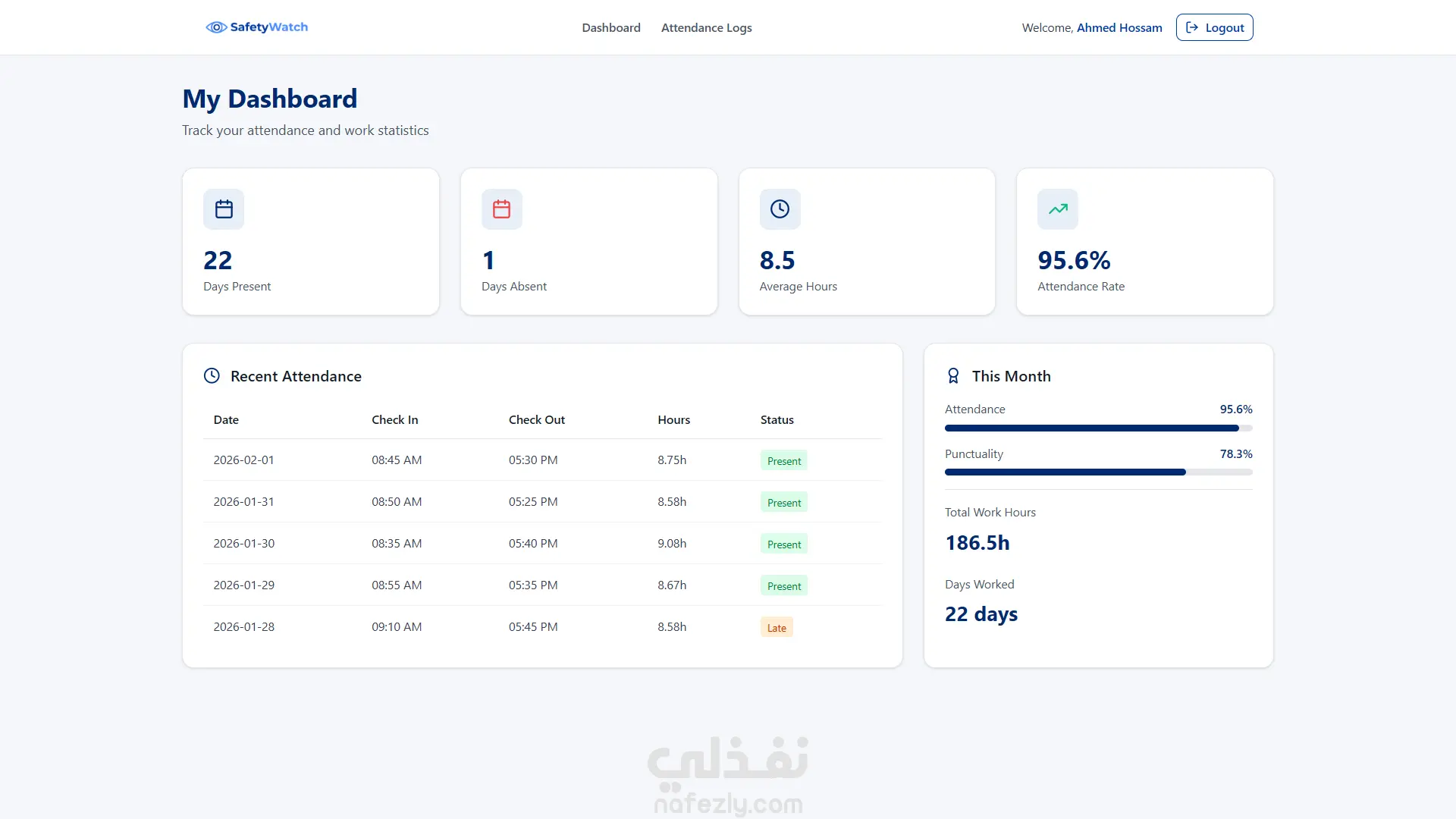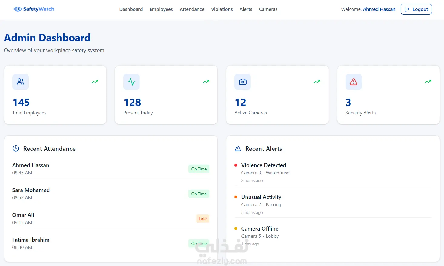 SafetyWatch نظام ذكي بيستخدم تعلم الآلة ورؤية الكمبيوتر عشان يكتشف المخاطر في الشغل لحظيًا ويبعت إنذارات فورًا. كمان بيخزن الأحداث عشان تحليلات السلامة وبيتوافق مع كاميرات المراقبة الموجودة. التقنيات: Python، TensorFlow، Keras، OpenCV، Streamlit. دوري: صممت ودربت موديلات الذكاء الاصطناعي، عملت خط أنابيب رؤية الكمبيوتر للفيديوهات في الوقت الحقيقي، بنيت واجهة المستخدم، وحسّنت الأداء عشان الكشف يبقى دقيق وسريع. التأثير: بيساعد على منع الحوادث، بيحسّن السلامة في الشغل، وبيوفّر وقت في المراقبة.