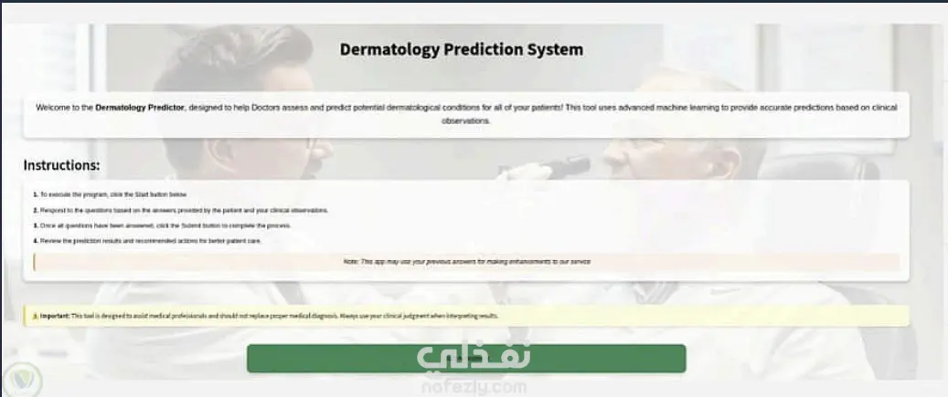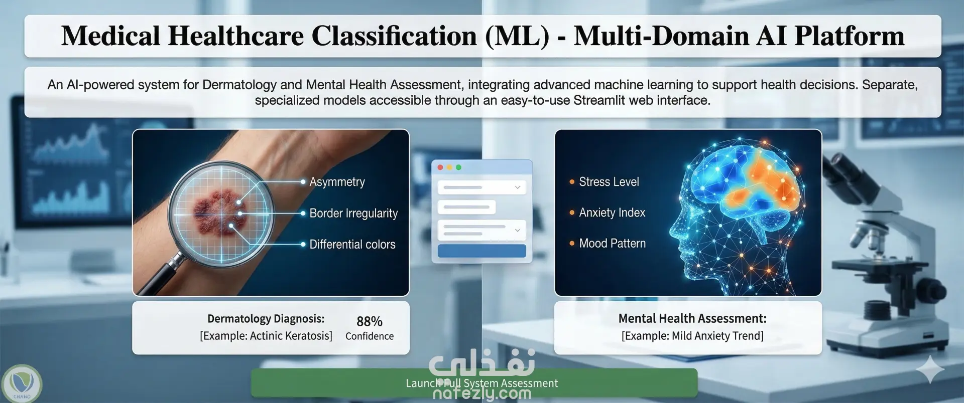 هذا المشروع يستهدف مجالين طبيين محددين: تشخيص أمراض الجلد وتقييم الصحة النفسية. يتكون من نموذجين مستقلين — الأول متخصص في تحليل حالات الجلد، والثاني في رصد المؤشرات النفسية — وكلاهما مدمج ضمن واجهة ويب سهلة الاستخدام مبنية بـ Streamlit، تتيح للمستخدم رفع بياناته واستقبال نتائج تشخيصية بشكل مباشر. المشروع مبني بهيكل مرن يفصل كل نموذج في وحدة مستقلة، مما يسهل التطوير والتوسع مستقبلاً. والهدف الأساسي منه هو تقديم أداة ذكاء اصطناعي في متناول الجميع لدعم القرارات الصحية.