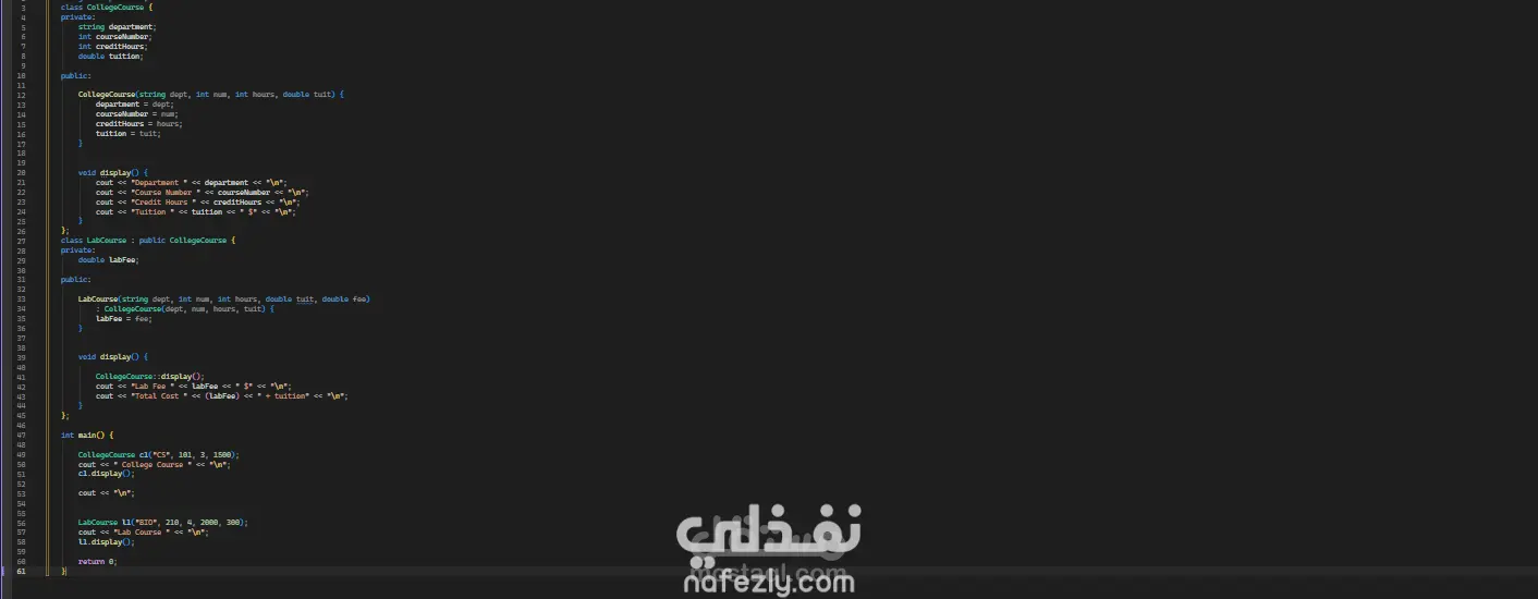 الفئة المشتقة (Derived Class): تسمى LabCourse وتتعامل مع الدورات التي تتضمن مختبرات (معامل).