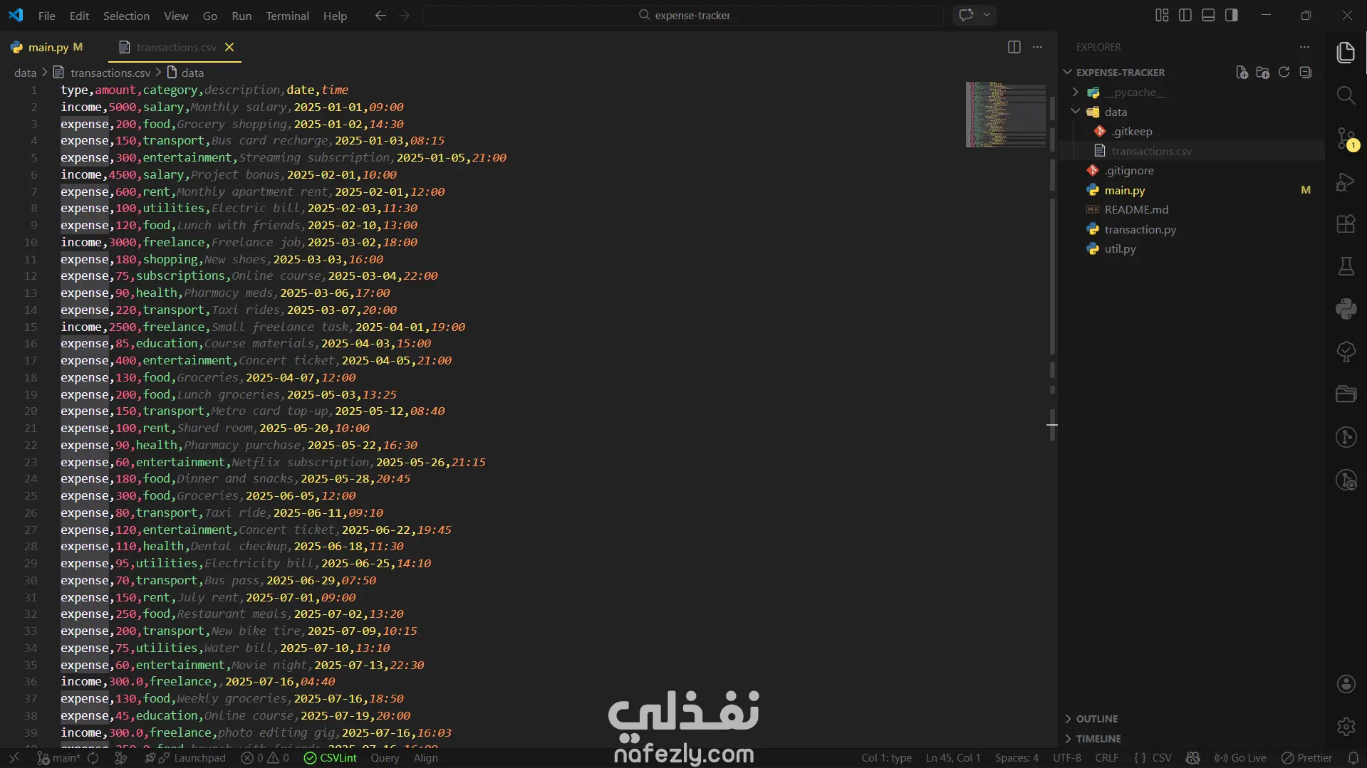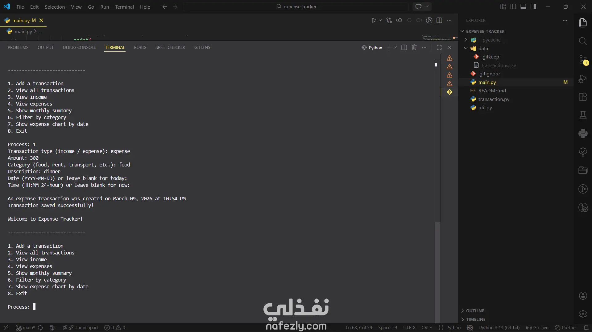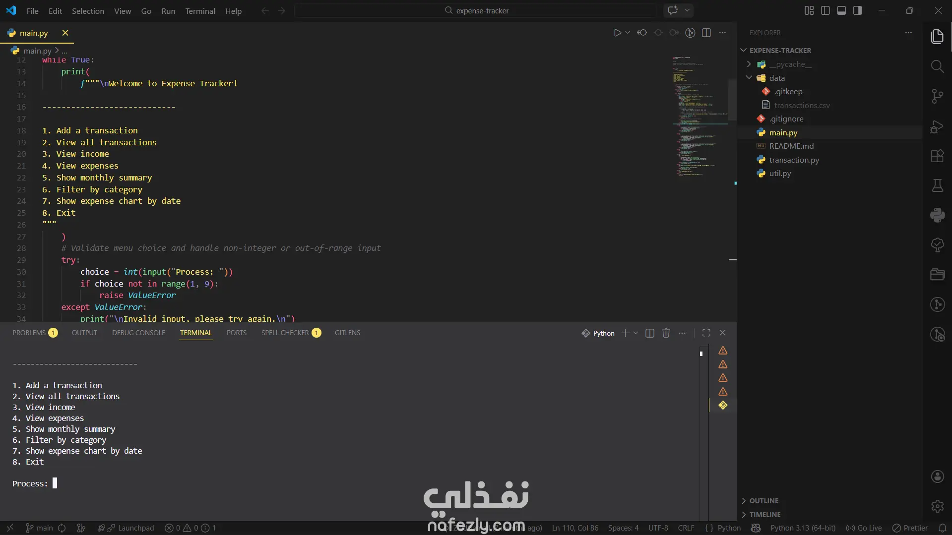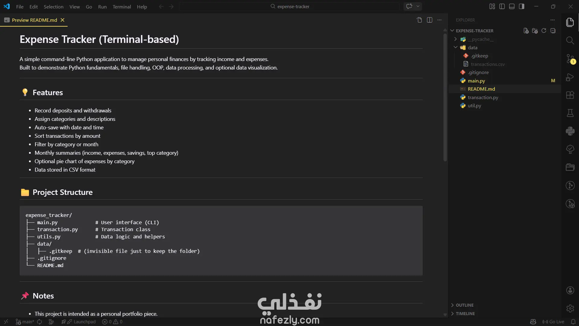 مشروع عملي قمت بتطويره باستخدام لغة Python لتسجيل المصاريف اليومية وتنظيمها. يتيح التطبيق إضافة المصروفات وتصنيفها وعرض تقارير بسيطة توضح إجمالي المصاريف حسب الفئة أو الفترة الزمنية. ركزت في هذا المشروع على كتابة كود واضح ومنظم، وتقسيم التطبيق إلى أجزاء مستقلة لتسهيل صيانته وتطويره لاحقًا. كما اهتممت بأن يكون منطق التطبيق بسيطًا وعمليًا وقابلًا للتوسعة بإضافة واجهة رسومية مستقبلًا. كان الهدف من المشروع تعزيز الفهم العملي للتعامل مع الملفات، وإدارة البيانات، وتنظيم منطق العمليات داخل التطبيق.