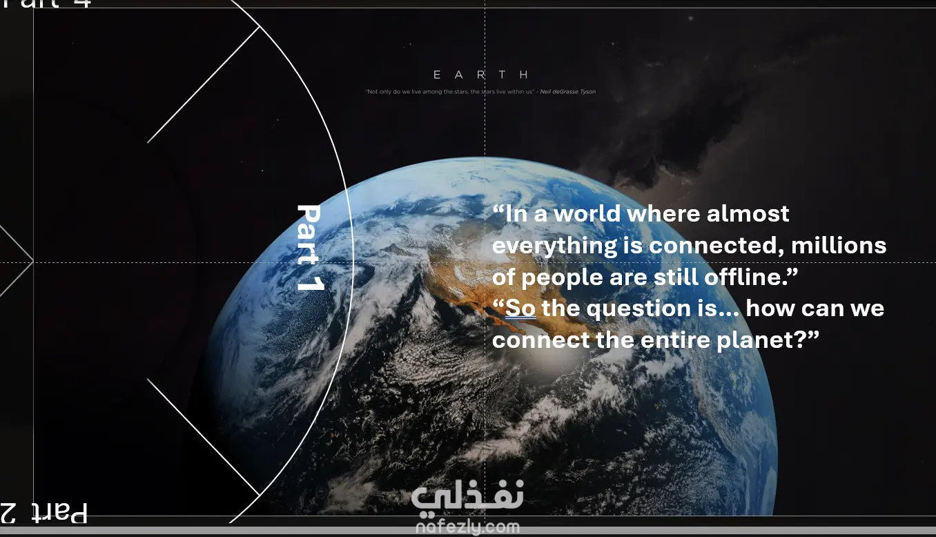 تُبرز هذه الصورة التحدي العالمي في عصر الترابط الرقمي، حيث لا يزال ملايين الأشخاص غير متصلين بالإنترنت رغم تطور التكنولوجيا. وتطرح تساؤلًا محوريًا حول كيفية توصيل العالم بأكمله، مع إبراز كوكب الأرض كرمز للوحدة، الاتساع، والمسؤولية المشتركة تجاه سد الفجوة الرقمية
