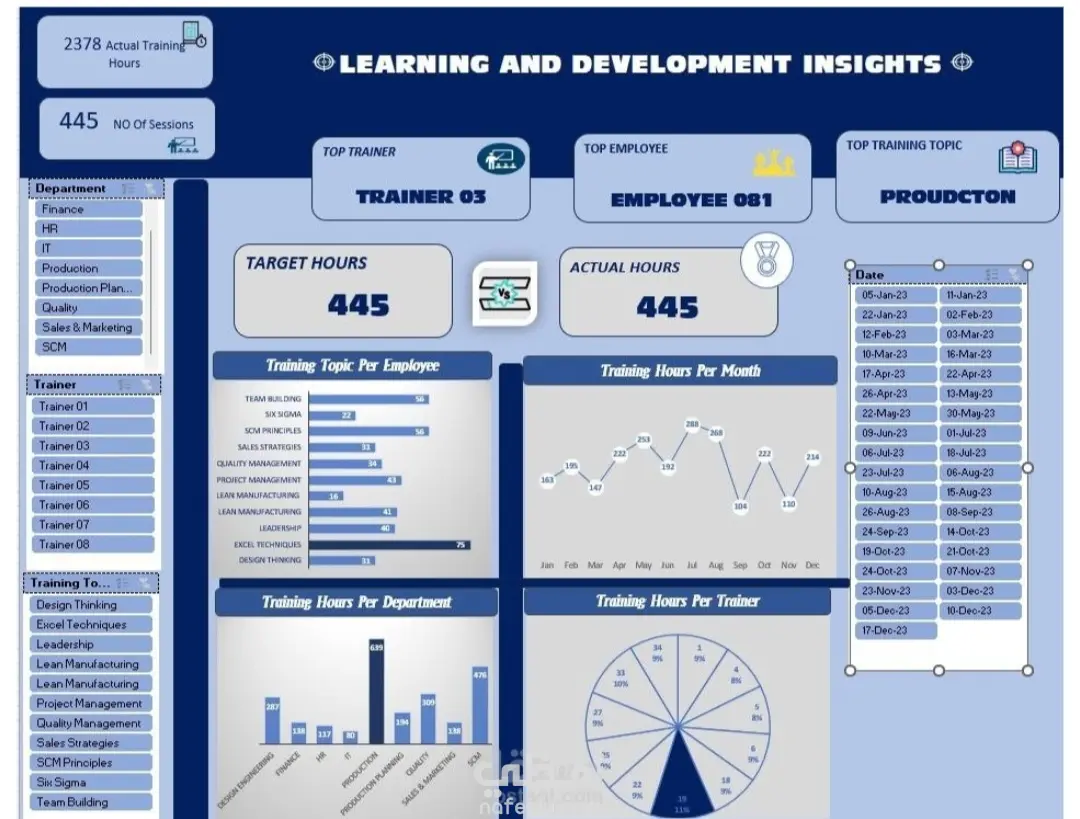 راقية الأداء تبيع أكثر من 2,378 ساعة تدريسية إجمالية موزعة على 445 جلسة. تحليل التوزيع : تحليل كيفية توزيع التدريب حسب القسم، والمدربة والموضوع التدريبي. رصد الاتجاهات تحليل الاتجاهات الشهرية لتحديد فترات الذروة التدريبية تحديد النخية الحديد أفضل الموظفين والمدربين أداء التكريم التميز. الأثر: تقديم رؤى قائمة على البيانات لتحسين جداول التدريب وضمان توافق الاقسام مع أهداف التعلم