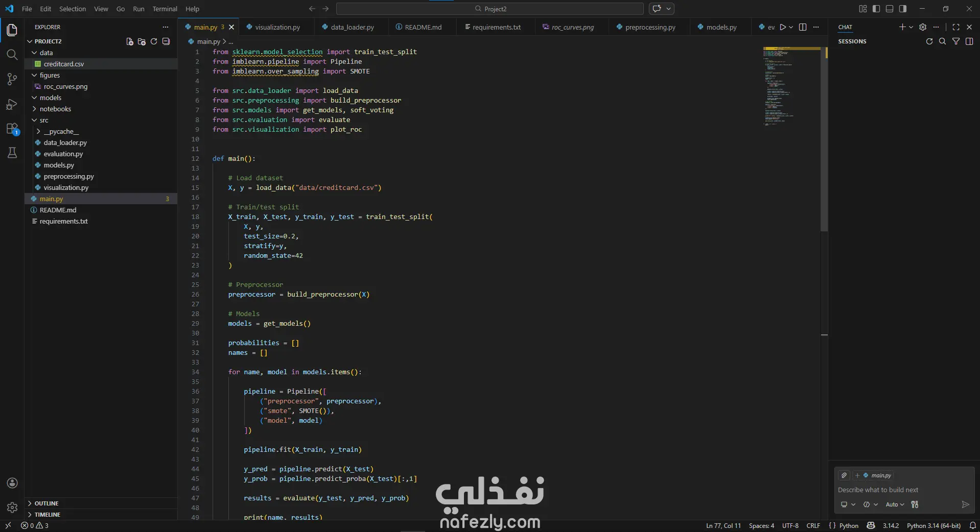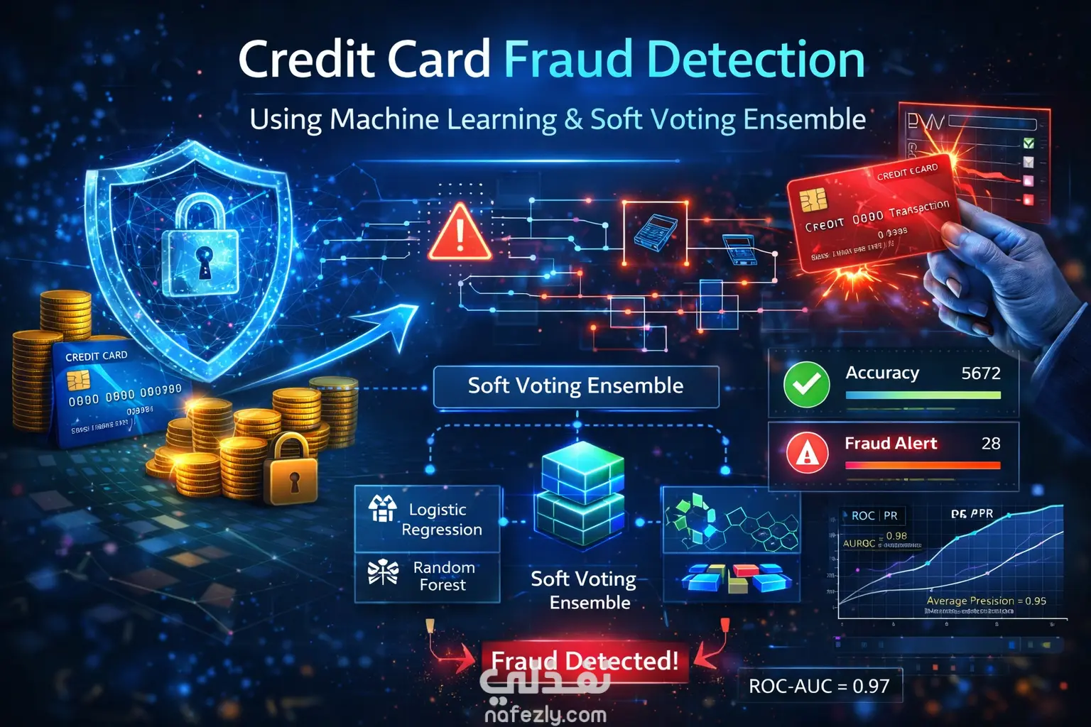 مشروع تعلم آلي يركز على اكتشاف عمليات الاحتيال في معاملات بطاقات الائتمان باستخدام تقنيات Machine Learning. يعتمد العمل على تحليل بيانات المعاملات المالية بهدف التعرف على الأنماط غير الطبيعية التي قد تدل على نشاط احتيالي. يتضمن المشروع دورة متكاملة لبناء نموذج تعلم آلي، تبدأ بمرحلة تنظيف البيانات ومعالجتها، ثم معالجة مشكلة عدم توازن الفئات باستخدام تقنيات مثل SMOTE، يلي ذلك تدريب عدة خوارزميات تعلم آلي من بينها Logistic Regression وRandom Forest وSVM وXGBoost.