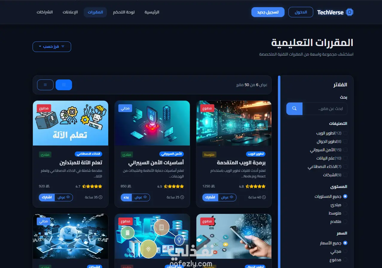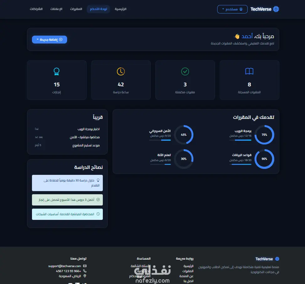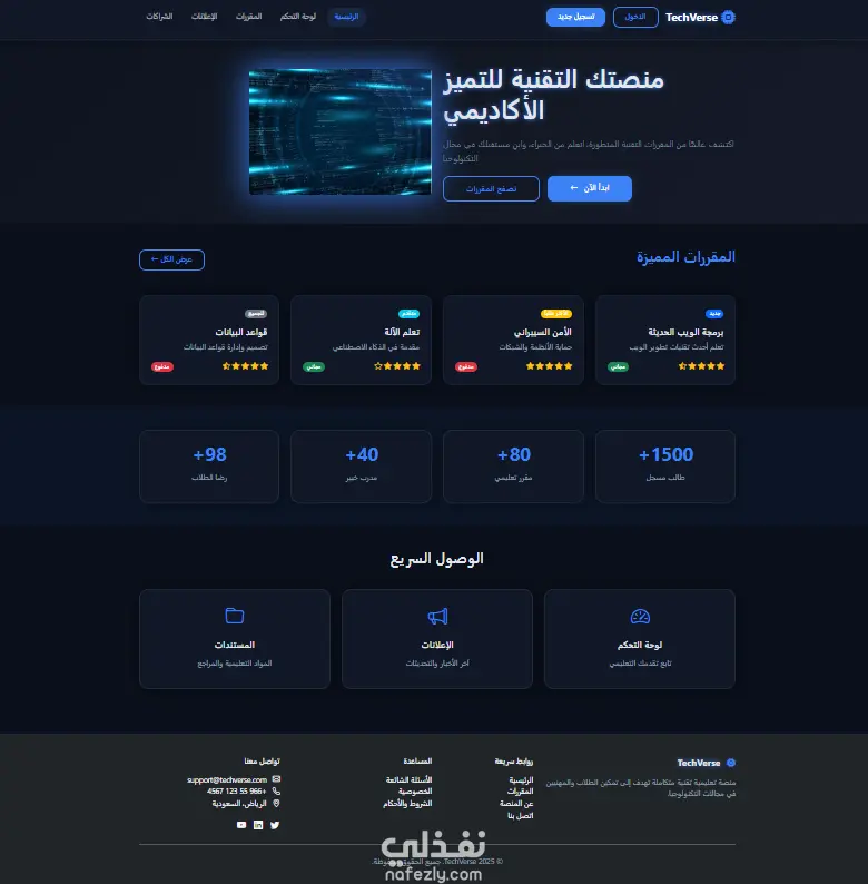 إنشاء منصة تعليمية تقنية متكاملة مثل TechVerse مع لوحة تحكم
