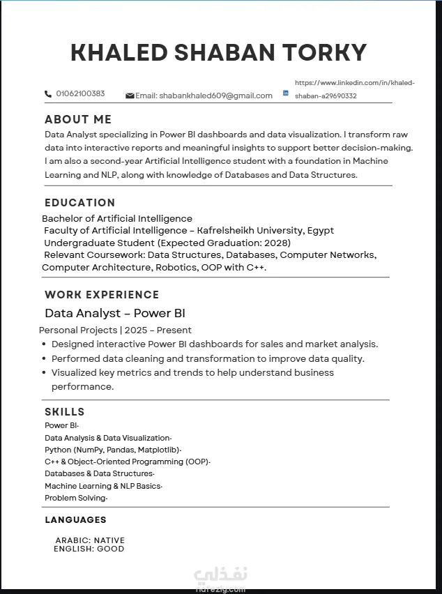 السلام عليكم انا خالد طالب بكليه الذكاء الاصطناعي لدي خبره كبيره في تصميم CV بشكل احترافي ومرتب وتقدر تقدم بيه في اي وظيفه