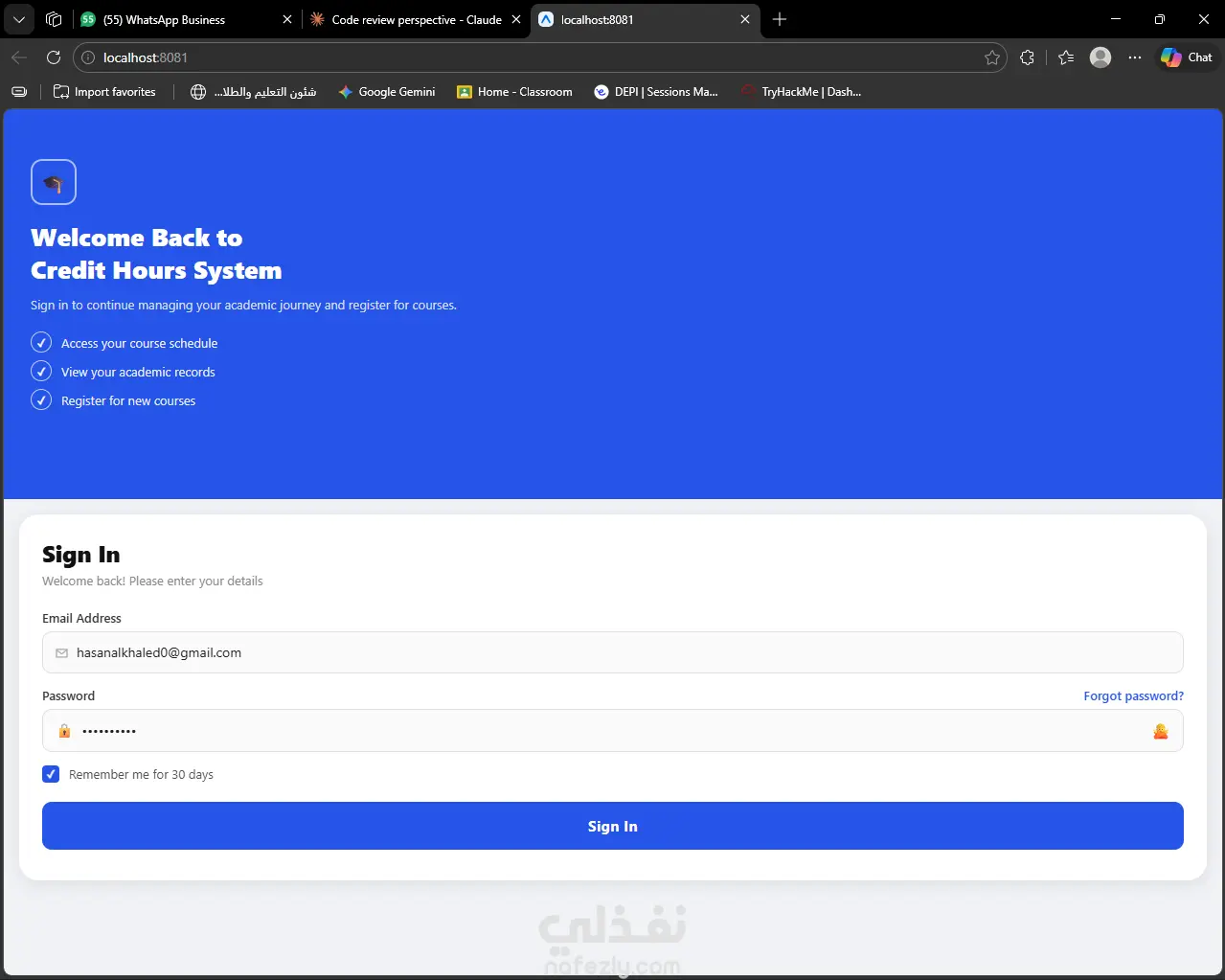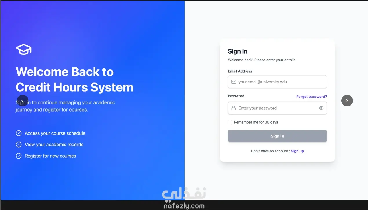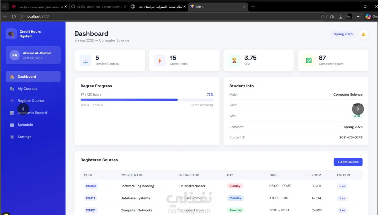 قمتُ بتصميم وتطوير منصة لتسجيل المقررات الدراسية تُمكّن الطلاب من إدارة جداولهم الأكاديمية بكفاءة ضمن نظام الساعات المعتمدة. يوفّر التطبيق آلية تحقق من المتطلبات السابقة (Prerequisites) من خلال نظام قفل، مما يضمن أن الطالب لا يمكنه التسجيل في أي مقرر قبل إتمام المقررات المطلوبة له.