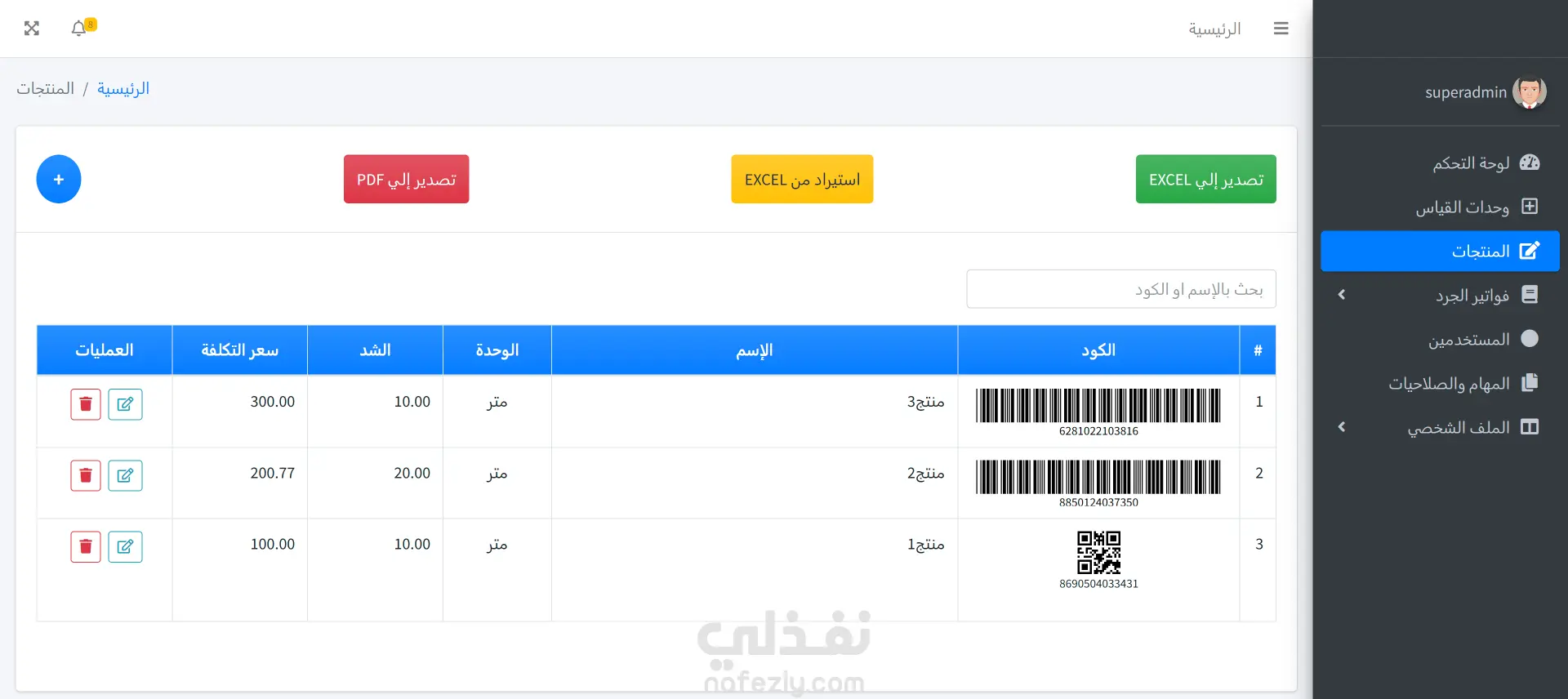إمكانية استيراد المنتجات من Excel، وتصدير المنتجات إلى Excel وPDF.