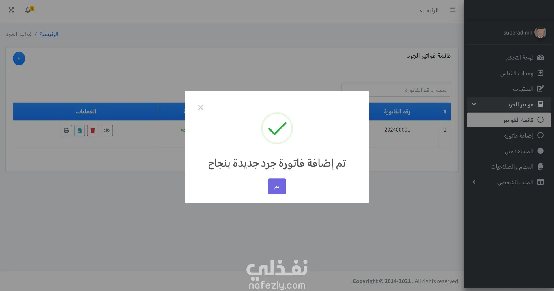 لوحة تحكم لإدارة الوحدات والمنتجات والفواتير والمستخدمين والصلاحيات والأدوار.