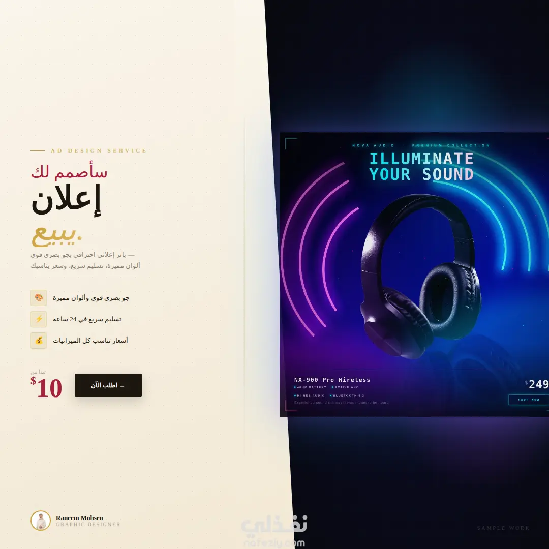 هل تريد بانراً يلفت الأنظار ويحول المتصفح لمشترٍ؟ أنا رنيم، مصممة جرافيك أجمع بين التفكير التقني والإبداع البصري. بانراتي بتتميز بـ 3 حاجات مع بعض جو بصري قوي، تسليم سريع، وأسعار تناسب الجميع. ماذا ستحصل عليه؟ بانر إعلاني أصلي مخصص لمنتجك أو خدمتك ألوان وجو بصري قوي يعكس هوية براندك تسليم سريع في أقصر وقت أسعار مناسبة تناسب كل الميزانيات ملف PNG بجودة عالية جاهز للنشر فوراً تعديلان مجانيان حتى تكون راضياً 100% قبل بدء العمل أحتاج منك: صورة المنتج أو الخدمة بجودة عالية اسم البراند واللون الأساسي النص المطلوب على البانر (أو اتركه لي) المقاس أو المنصة المستهدفة