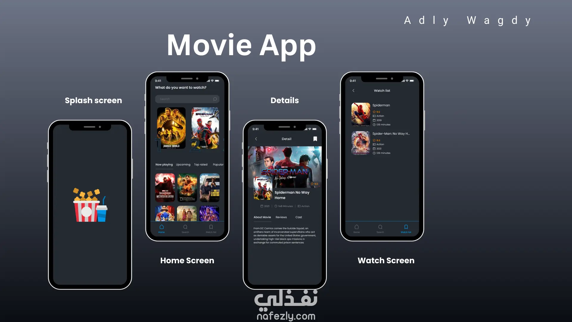 -Watch List: شاشة قائمة المشاهدة لعرض الأفلام المحفوظة وإدارتها بشكل مرتب.