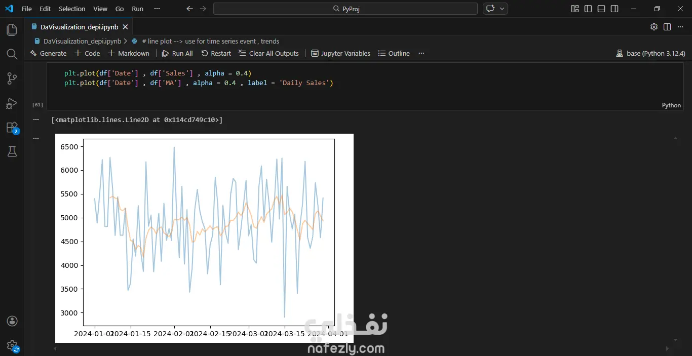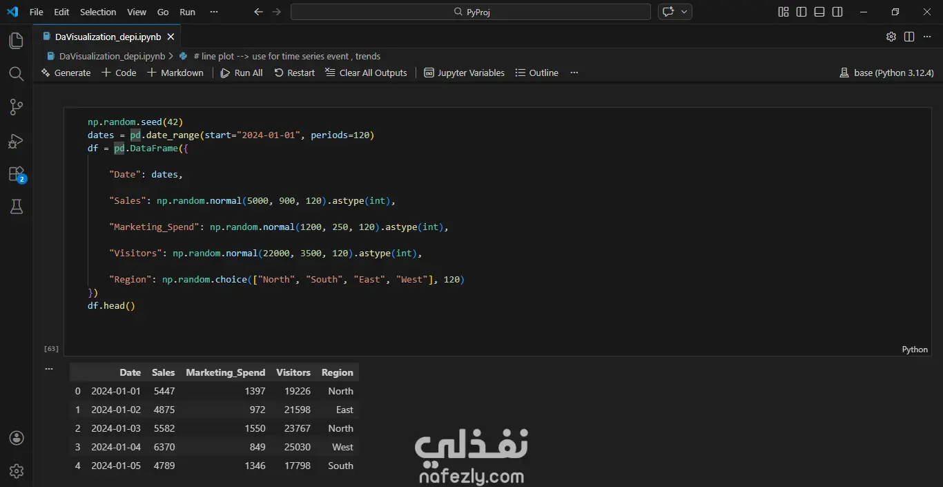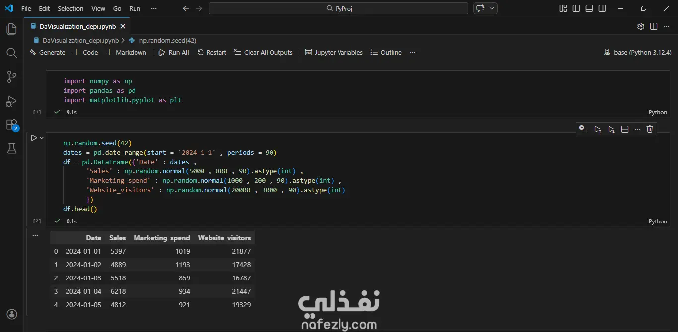 يهدف هذا المشروع إلى تحليل وتصور بيانات موقع إلكتروني لفهم العلاقة بين **المبيعات والإنفاق التسويقي وعدد زوار الموقع** خلال فترة زمنية محددة. قمت باستخدام لغة **Python** لتحليل البيانات ومعالجتها، بالإضافة إلى مكتبات متخصصة في تصور البيانات مثل **Matplotlib** و **Seaborn** لإنشاء رسوم بيانية واضحة تساعد على اكتشاف الأنماط والاتجاهات داخل البيانات. يتضمن المشروع: * تحليل تطور المبيعات عبر الزمن. * دراسة العلاقة بين الإنفاق التسويقي والمبيعات. * تحليل عدد زوار الموقع وتأثيره على الأداء التجاري. * إنشاء رسوم بيانية تساعد على فهم البيانات واتخاذ قرارات مبنية على البيانات. يساعد هذا النوع من التحليل الشركات وأصحاب المواقع على فهم أداء الموقع بشكل أفضل، وتقييم فعالية الحملات التسويقية، واتخاذ قرارات استراتيجية لتحسين المبيعات وزيادة عدد الزوار.