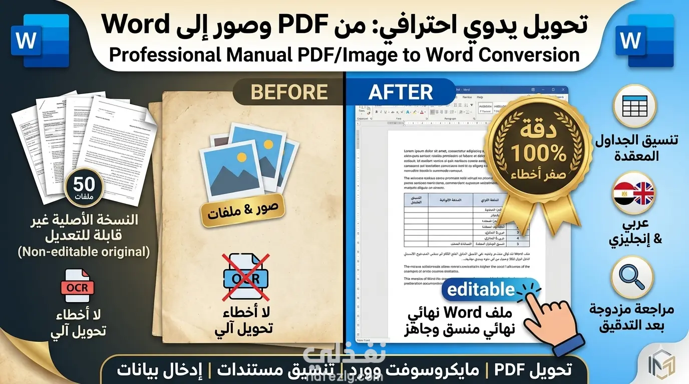تحويل يدوي لـ 50 صورة وملفات PDF إلى Word (تنسيق مطابق ودقة 100%)