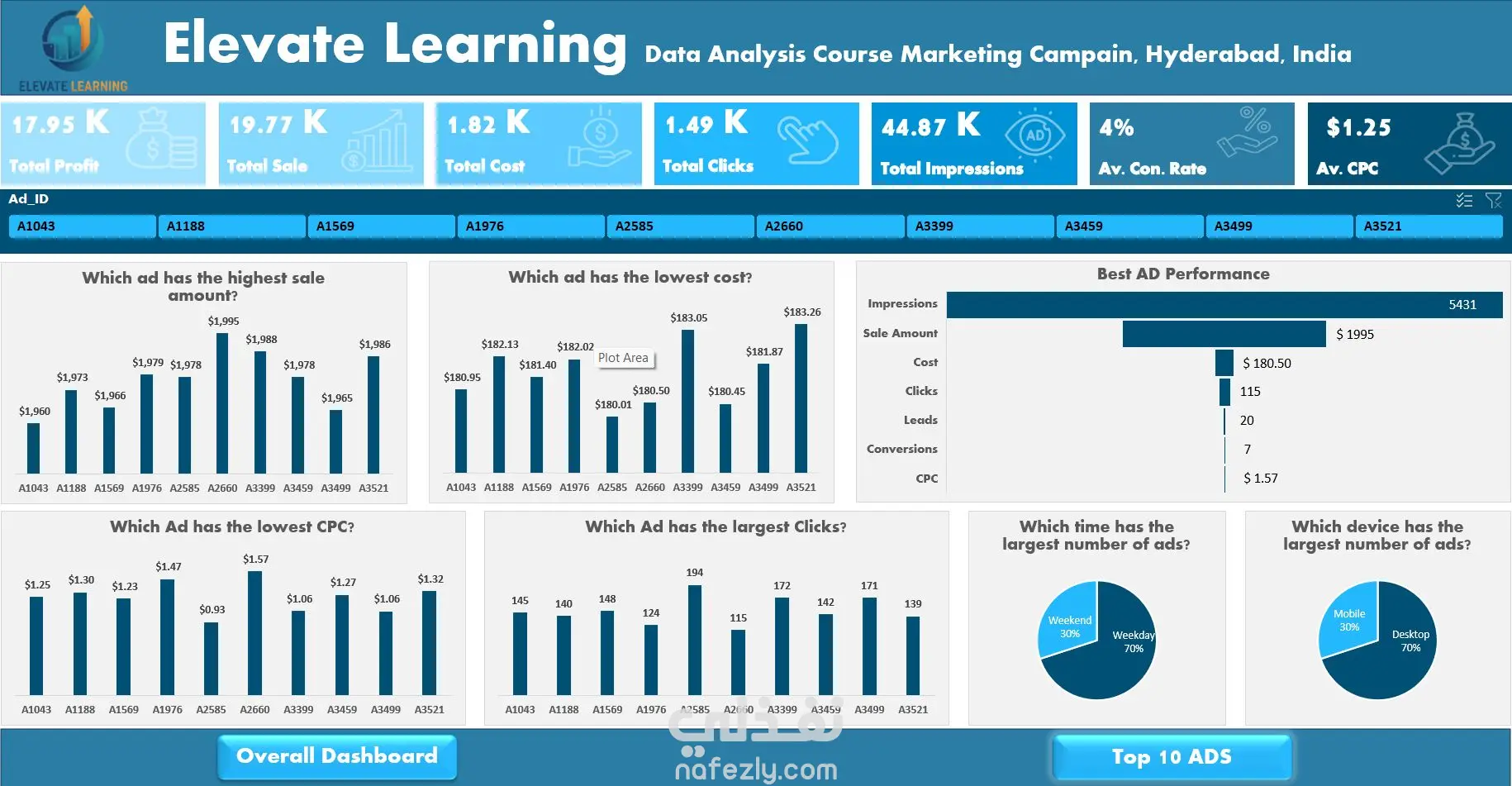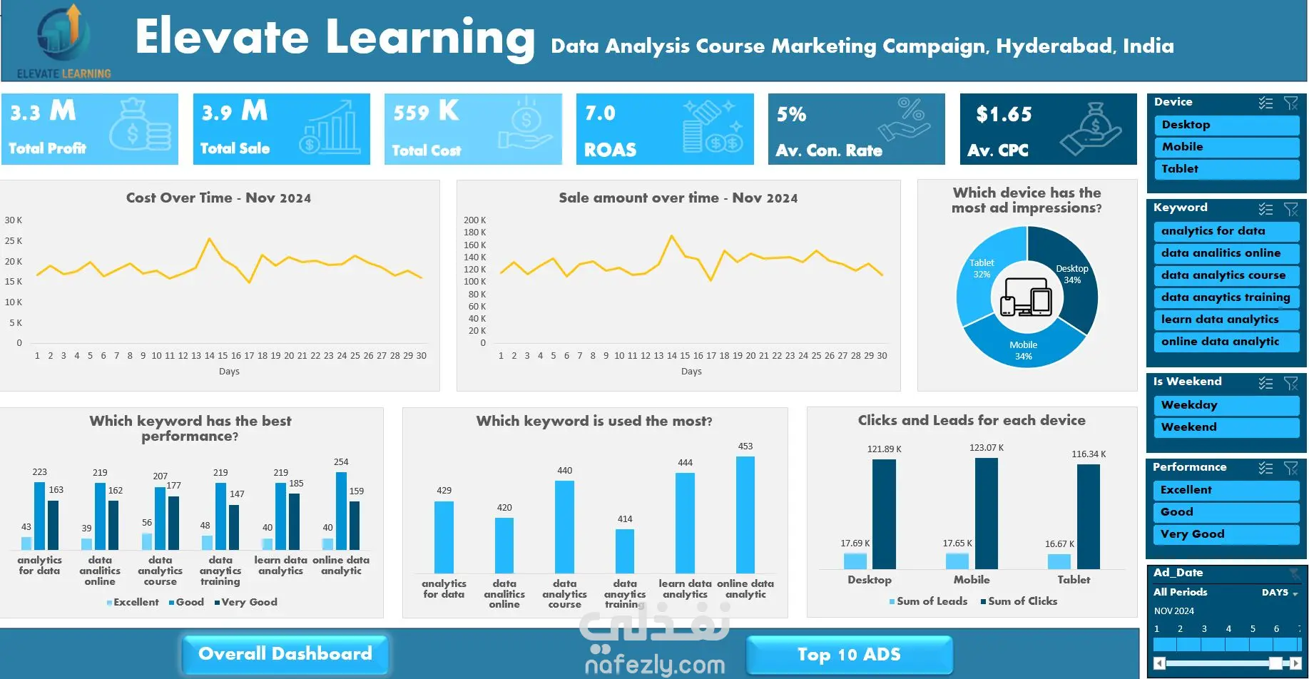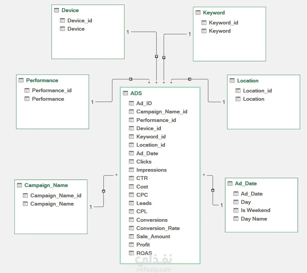 هذا المشروع عبارة عن تحليل متقدم لبيانات الحملات التسويقية الرقمية باستخدام Excel و Power Query، حيث تم البدء باستيراد البيانات الخام وتنظيفها باستخدام Power Query من خلال توحيد التنسيقات، معالجة القيم المفقودة، وإزالة التكرارات، ثم الانتقال إلى هندسة الميزات عبر حساب مؤشرات الأداء الرئيسية مثل CTR (نسبة النقر إلى الظهور)، CPC (تكلفة النقرة)، CPL (تكلفة العميل المحتمل)، و ROAS (العائد على الإنفاق الإعلاني)، وبناء نموذج بيانات Star Schema يتكون من جداول الأبعاد (التاريخ، الحملات، الأجهزة، الكلمات المفتاحية) وجدول الحقائق، وتصميم لوحة تحكم تفاعلية تحتوي على بطاقات أداء رئيسية تعرض إجمالي الإنفاق ($15,000)، متوسط ROAS (4.8x)، وتحليل أفضل 10 إعلانات، مع رسوم بيانية تحلل الأداء حسب نوع الجهاز (Mobile 45%، Desktop 35%، Tablet 20%)، وأفضل الكلمات المفتاحية ("تسويق رقمي" بــ ROAS 7.2x)، وإتاحة التصفية حسب المنصة والشهر والجهاز مع تحديث ديناميكي لجميع المؤشرات، وتقديم توصيات تسويقية مبنية على النتائج مثل إعادة توزيع الميزانية وتحسين استراتيجية الكلمات المفتاحية، ليصبح المشروع أداة متكاملة للمسوقين وأصحاب الأعمال لتحسين أداء حملاتهم وزيادة العائد على الاستثمار.