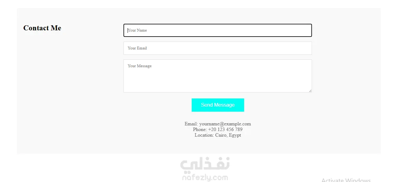 قسم Contact يحتوي على Contact Form للتواصل وإرسال الرسائل.