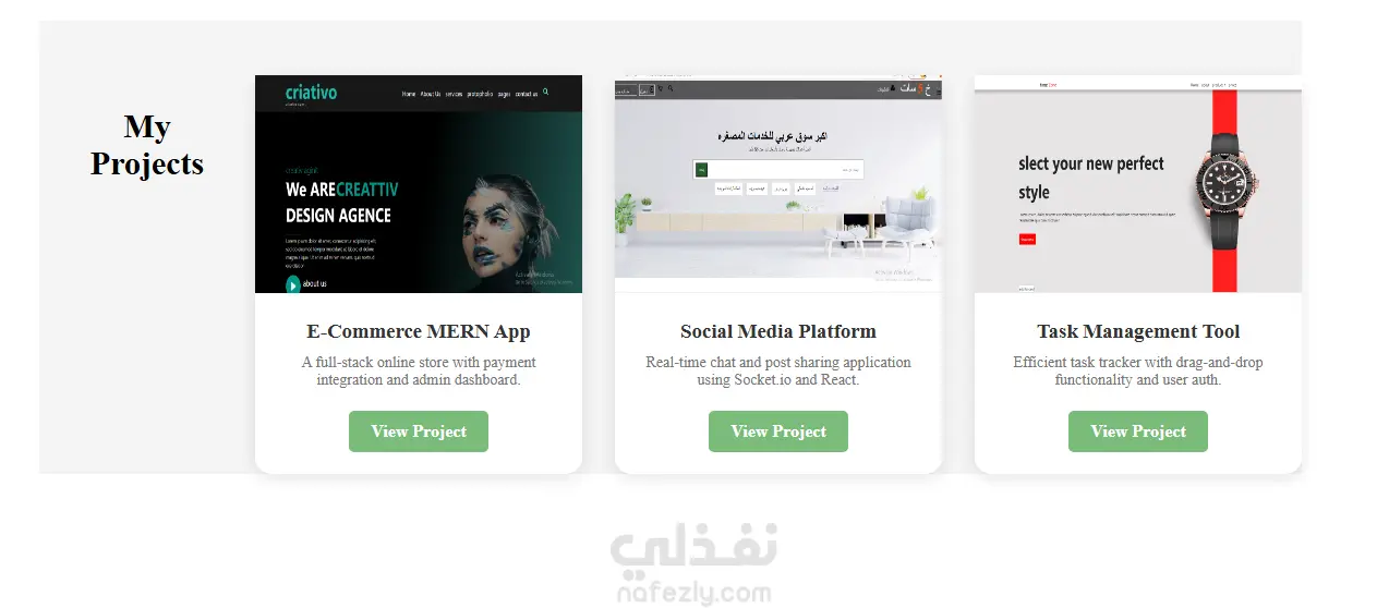 قسم Projects لعرض المشاريع مع صور ووصف لكل مشروع.