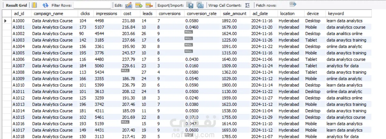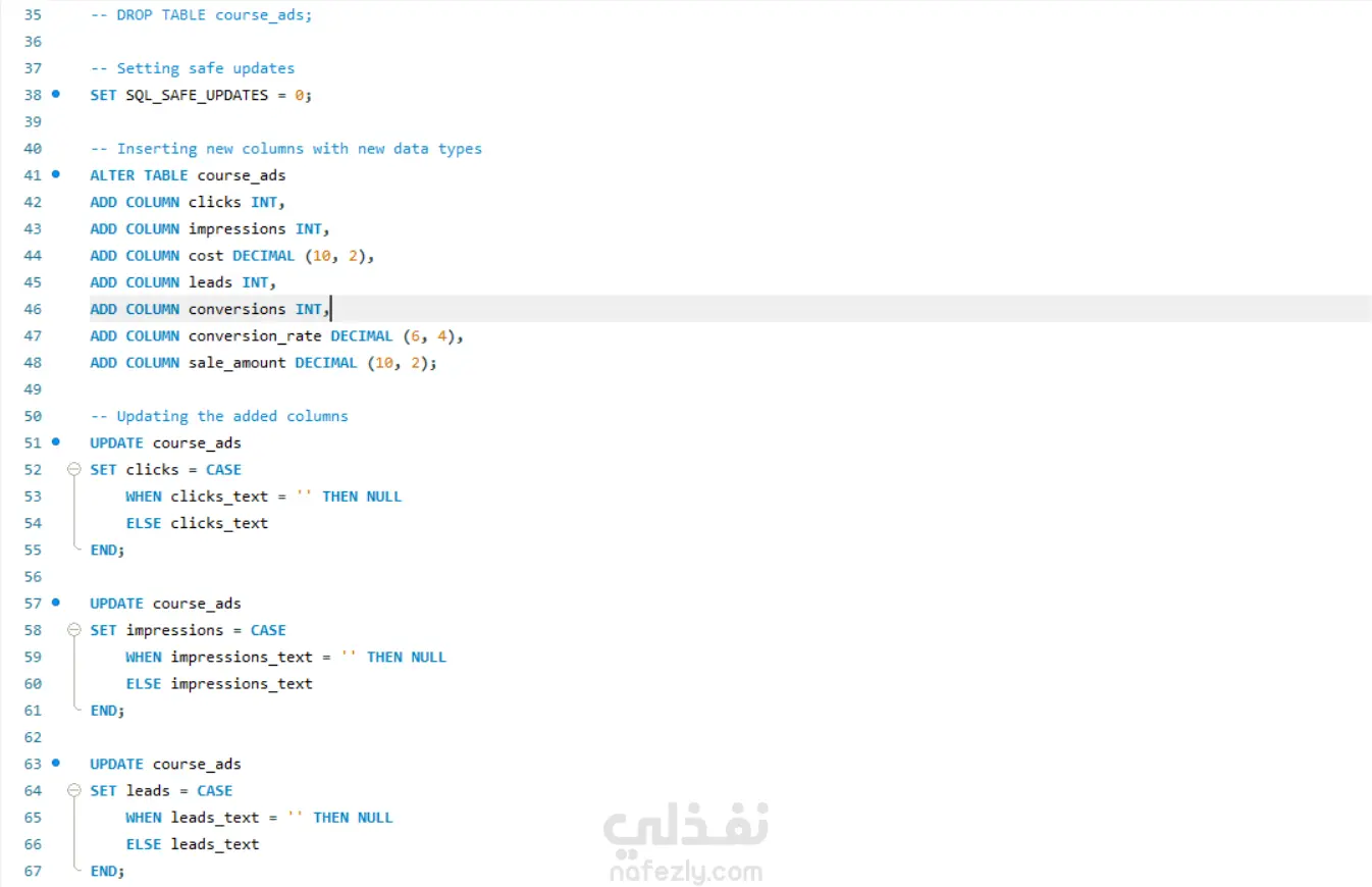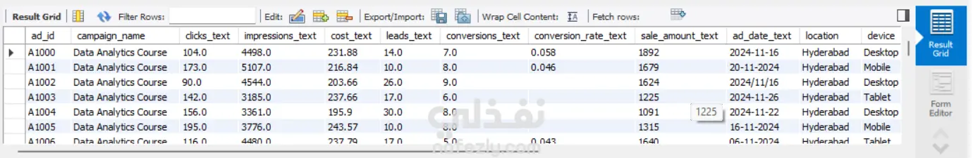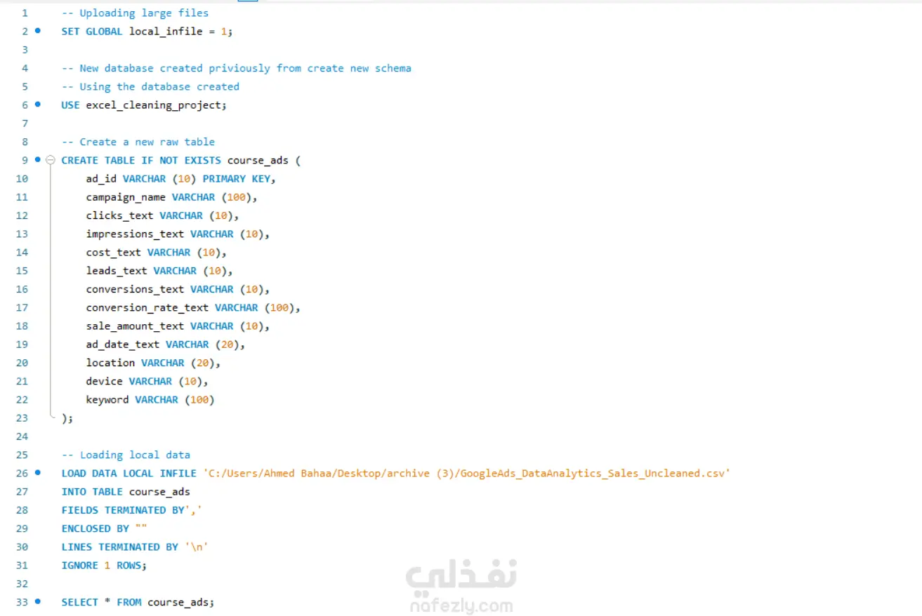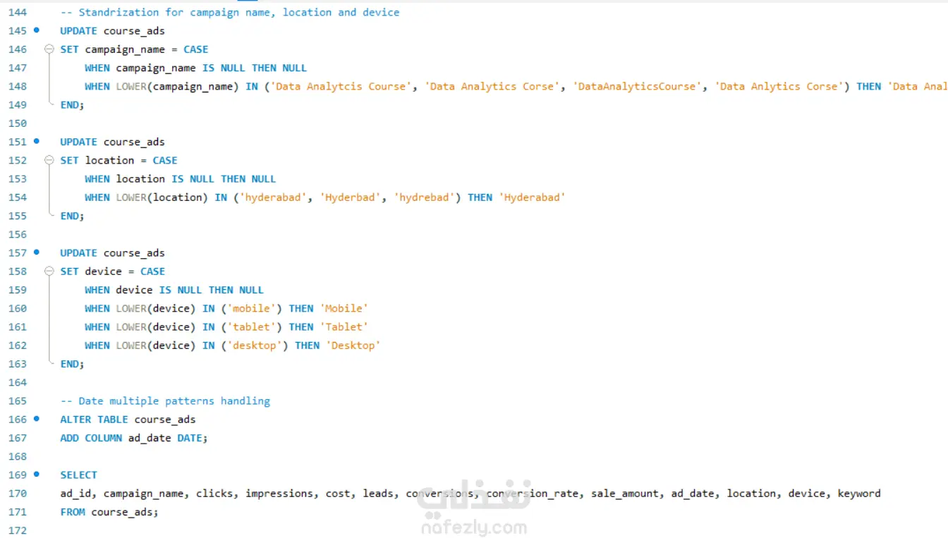 هذا المشروع عبارة عن عملية تنظيف وتحليل متكاملة لمجموعة من البيانات باستخدام SQL، حيث تم استيراد البيانات الخام غير النظيفة من ملف CSV وإنشاء قاعدة بيانات علائقية متكاملة. بدأت عملية التنظيف بإنشاء جدول رئيسي (course_ads) وإضافة أعمدة جديدة بأنواع بيانات مناسبة (INT, DECIMAL) لتحويل النصوص إلى أرقام قابلة للتحليل، ثم تحديث هذه الأعمدة بعد معالجة القيم الفارغة وإزالة الرموز الخاصة مثل علامة الدولار ($) من أعمدة التكلفة والمبيعات. قمت بتحليل القيم المفقودة باستخدام استعلامات تلخيصية (SUM) لاكتشاف نسبة الفجوات في كل عمود، والتحقق من التكرارات باستخدام GROUP BY للتأكد من عدم وجود سجلات مكررة في ad_id، ثم تنفيذ عملية توحيد المعايير (Standardization) للأعمدة النصية مثل campaign_name (توحيد تسميات دورات تحليل البيانات), location (توحيد كتابة المدن مثل Hyderabad), و device (توحيد أسماء الأجهزة إلى Mobile, Desktop, Tablet). كما تم التعامل مع تعدد أنماط التواريخ في عمود ad_date_text من خلال كتابة استعلام CASE معقد يستخدم التعبيرات النمطية (REGEXP) لاكتشاف 5 تنسيقات مختلفة للتواريخ (YYYY-MM-DD, DD/MM/YYYY, YYYY/MM/DD, DD-MM-YYYY, MM/DD/YYYY) وتحويلها إلى نوع DATE موحد باستخدام STR_TO_DATE. المشروع يبرز حلول عديدة في SQL تشمل إنشاء الجداول، استيراد البيانات، معالجة القيم النصية، التحديثات الشرطية، تحليل التكرارات، وتوحيد البيانات، مما ينتج قاعدة بيانات نظيفة وجاهزة للتحليل وإنشاء لوحات التحكم والتقارير التسويقية.