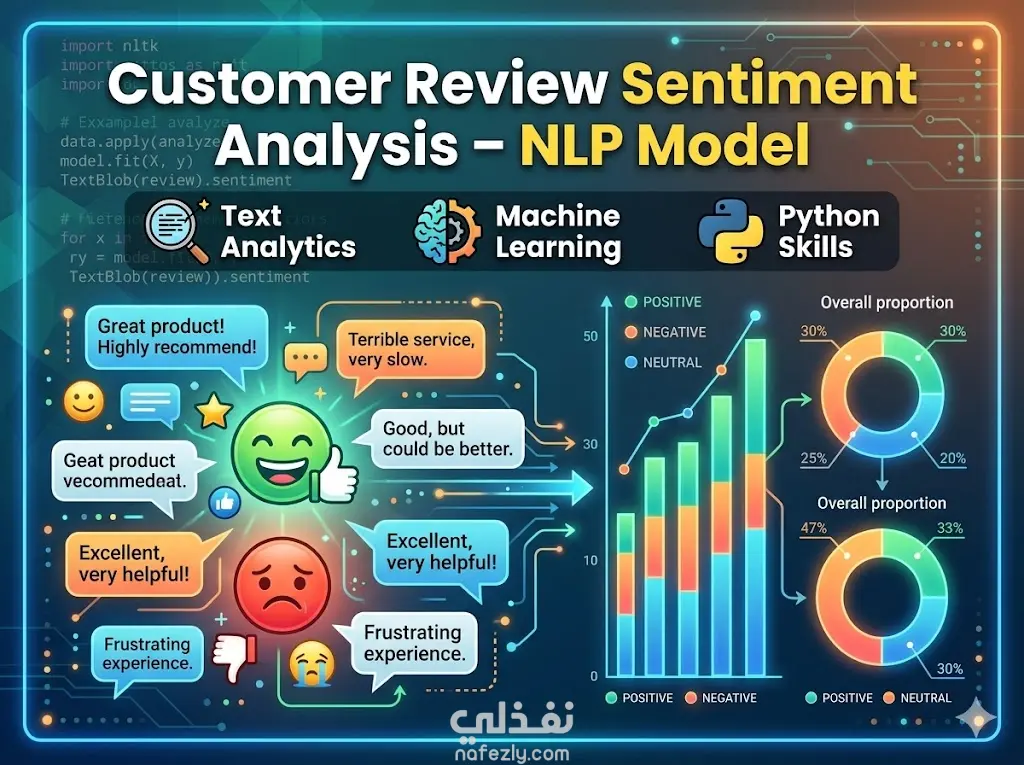 قمت بتطوير نموذج لتحليل مشاعر النصوص وتصنيفها إلى إيجابية أو سلبية باستخدام تقنيات معالجة اللغة الطبيعية (NLP). شمل العمل تنظيف النصوص، تحويلها إلى بيانات رقمية باستخدام TF-IDF، ثم تدريب نموذج للتصنيف. يساعد هذا النوع من المشاريع في فهم آراء المستخدمين وتحليل البيانات النصية بشكل ذكي.