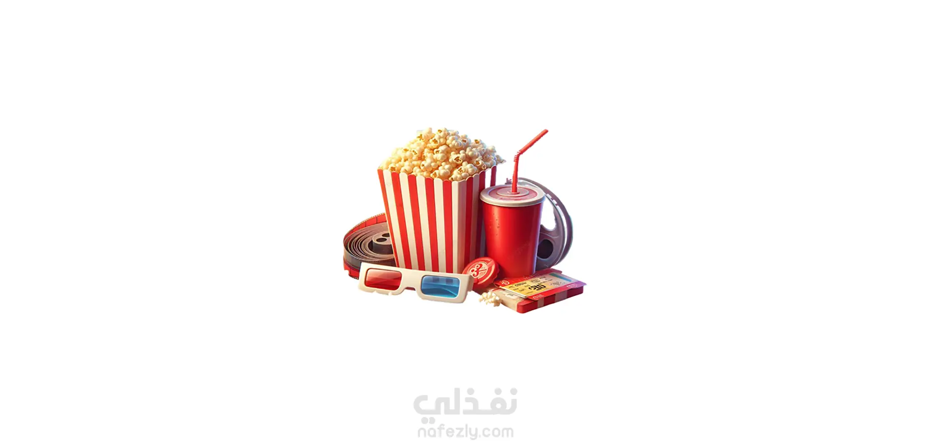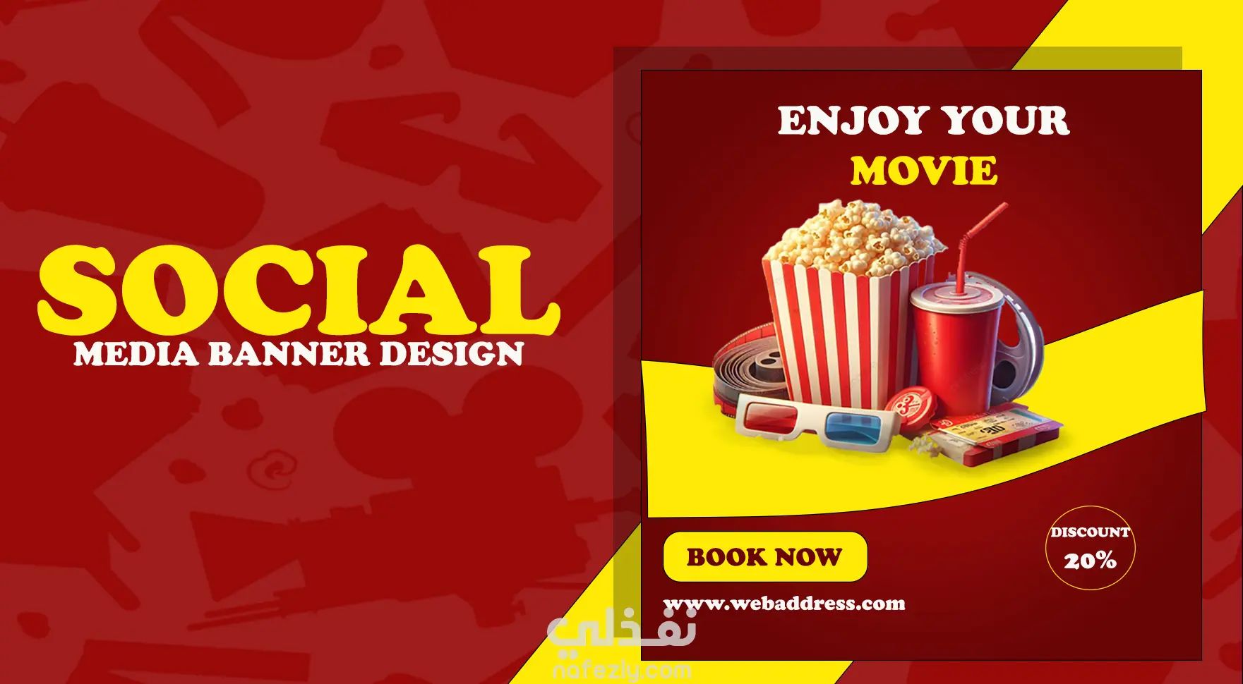 اعتماد نظام ألوان "الأحمر والأسود والأصفر" الكلاسيكي للسينما لإثارة الحماس والشهية. توزيع العناصر ثلاثية الأبعاد (الفشار والمشروب) في مركز التصميم لخلق عمق بصري واقعي. تقسيم الشاشة بشكل قطري لتوجيه عين المشاهد من العرض (خصم 20%) إلى زر الحجز مباشرة.