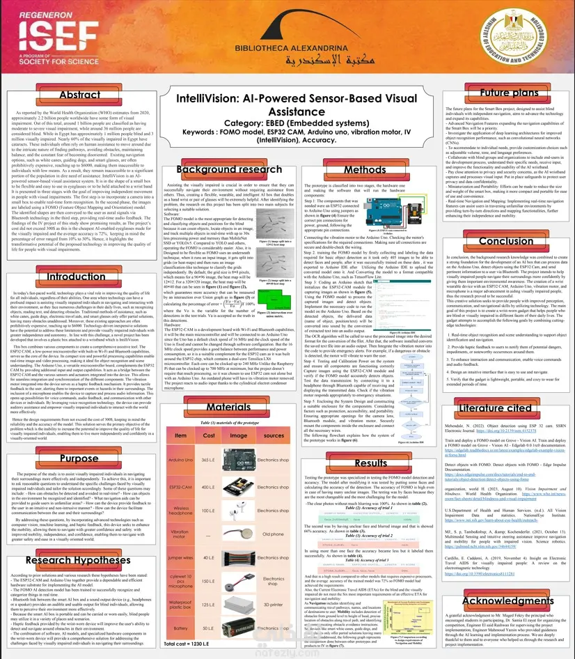 قمت بالعمل في تصميم وتطوير جهاز ذكي قابل للارتداء لمساعدة المكفوفين على التعرف على البيئة المحيطة بهم والتنقل باستقلالية باستخدام تقنيات الذكاء الاصطناعي والرؤية الحاسوبية. يعتمد النظام على كاميرا ESP32-CAM ونموذج الذكاء الاصطناعي FOMO Object Detection للتعرّف على الأجسام في الوقت الحقيقي، ثم تحويل هذه المعلومات إلى تنبيهات صوتية عبر البلوتوث، بالإضافة إلى تنبيه اهتزازي للحالات الطارئة. دوري في المشروع: توصيل وبرمجة ESP32-CAM مع Arduino Uno تدريب نموذج FOMO على صور مخصصة واستخراج النموذج بصيغة متوافقة مع Arduino (TensorFlow Lite) كتابة الكود المسؤول عن التقاط الصور ومعالجتها وتشغيل النموذج ربط النظام بسماعة بلوتوث لإخراج الصوت الناتج عن التعرف على الأجسام دمج محرك الاهتزاز للتنبيهات الطارئة اختبار دقة النموذج في ظروف تصوير مختلفة وتحليل النتائج آلية عمل الجهاز: التقاط صورة عبر ESP32-CAM تحليل الصورة باستخدام نموذج FOMO تحديد نوع ومكان الجسم تحويل النتائج إلى صوت يُسمع عبر سماعة بلوتوث تشغيل الاهتزاز عند وجود عائق أو خطر نتائج المشروع: تكلفة الجهاز أقل من 300$ مقارنة بمنتجات تصل إلى 6000$ متوسط دقة النموذج 72% دقة 100% في الصور الواضحة و 66% في الصور غير الواضحة قدرة النظام على التعرف على عدة أجسام في نفس الوقت جهاز صغير قابل للارتداء على اليد أو النظارة التقنيات المستخدمة: ESP32-CAM — Arduino Uno — FOMO Model — TensorFlow Lite — Computer Vision — Bluetooth Audio — Vibration Motor — Arduino IDE هذا المشروع يوضح القدرة على دمج الذكاء الاصطناعي مع الأنظمة المدمجة (Embedded Systems) لتقديم حل عملي منخفض التكلفة يحل مشكلة حقيقية في المجتمع.