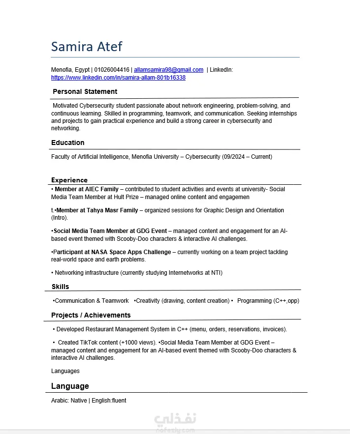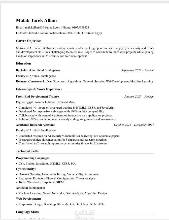 قمت بإعداد وتصميم سيرة ذاتية احترافية تساعد على إبراز المهارات والخبرات بشكل منظم وجذاب، مع مراعاة توافقها مع أنظمة تتبع المتقدمين للوظائف (ATS) التي تستخدمها العديد من الشركات في فرز السير الذاتية. تم التركيز على تنظيم المعلومات بشكل واضح، واستخدام تنسيق احترافي يسهل قراءته من قبل مسؤولي التوظيف وأنظمة الفرز الإلكترونية. كما تم تحسين ترتيب الأقسام والكلمات المفتاحية لزيادة فرص ظهور السيرة الذاتية في نتائج التوظيف. العمل مناسب للباحثين عن وظيفة أو لمن يرغب في تطوير سيرته الذاتية لتكون أكثر احترافية وجاهزة للتقديم على فرص العمل المختلفة.
