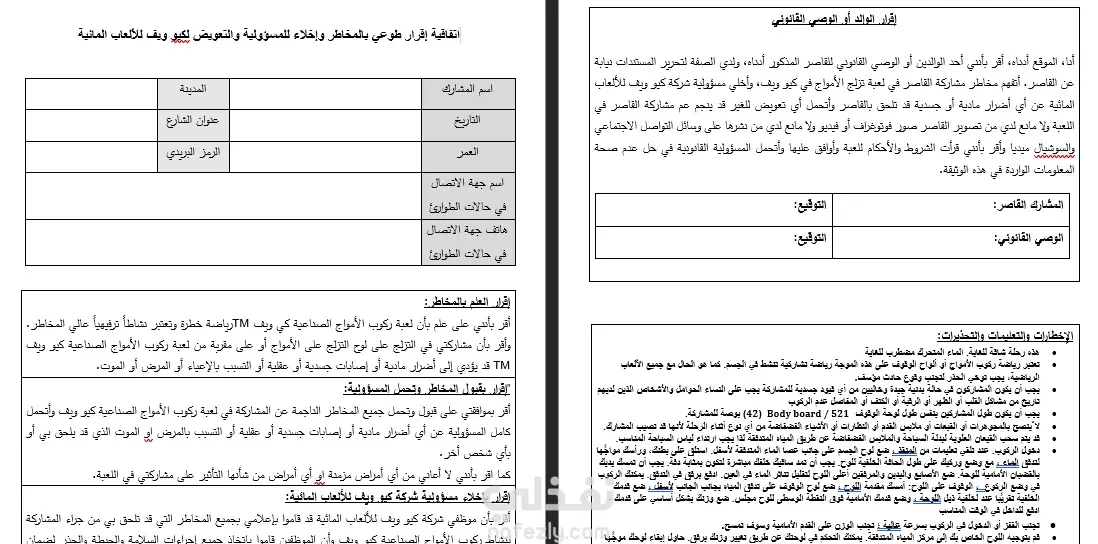 تم اعداد اتفاقية قانونية لشركة ألعاب مائية تتضمن الاتفاقية اخلاء مسؤولية الشركة عن اي اضرار تصيب اللاعبين اثناء ممارسة رياضة ركوب الامواج