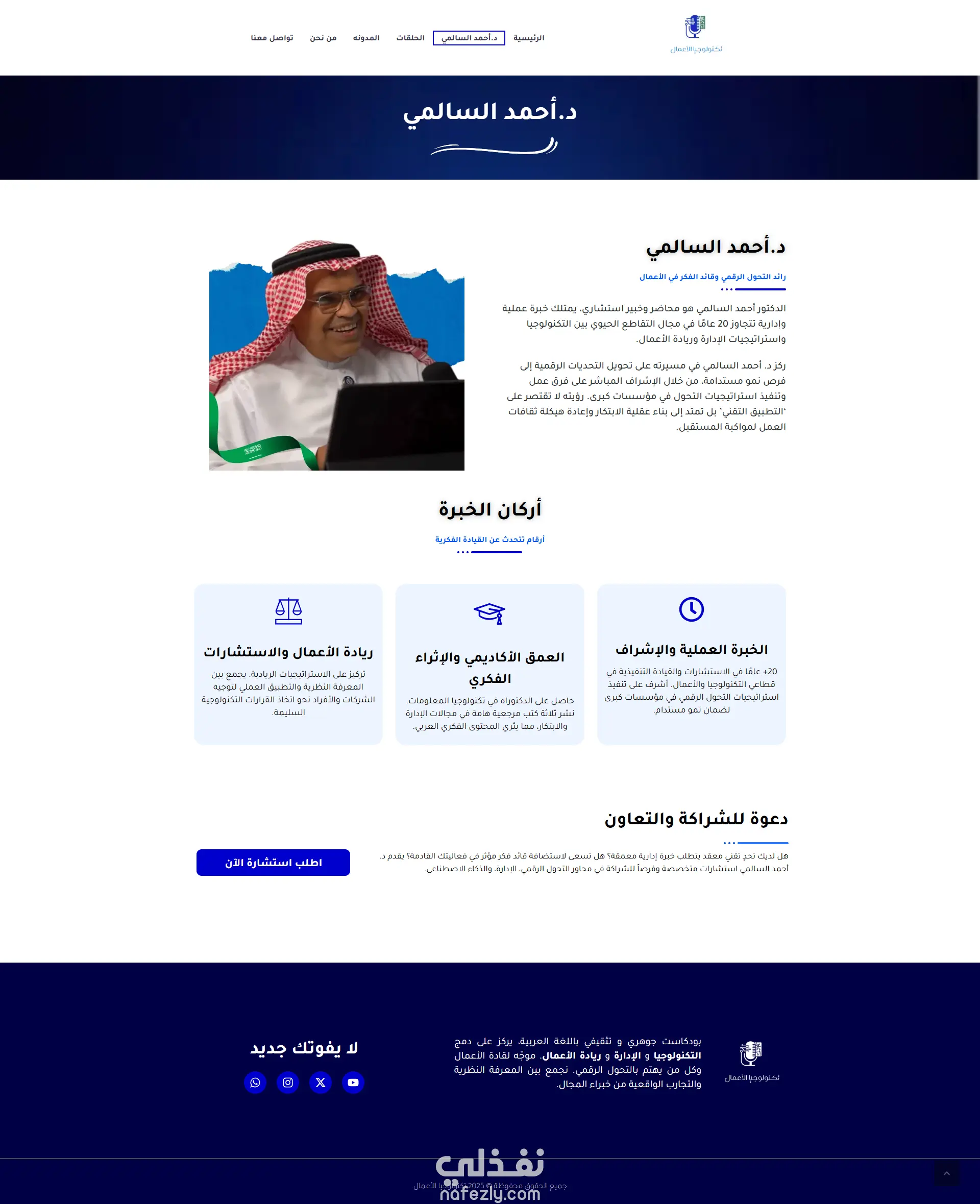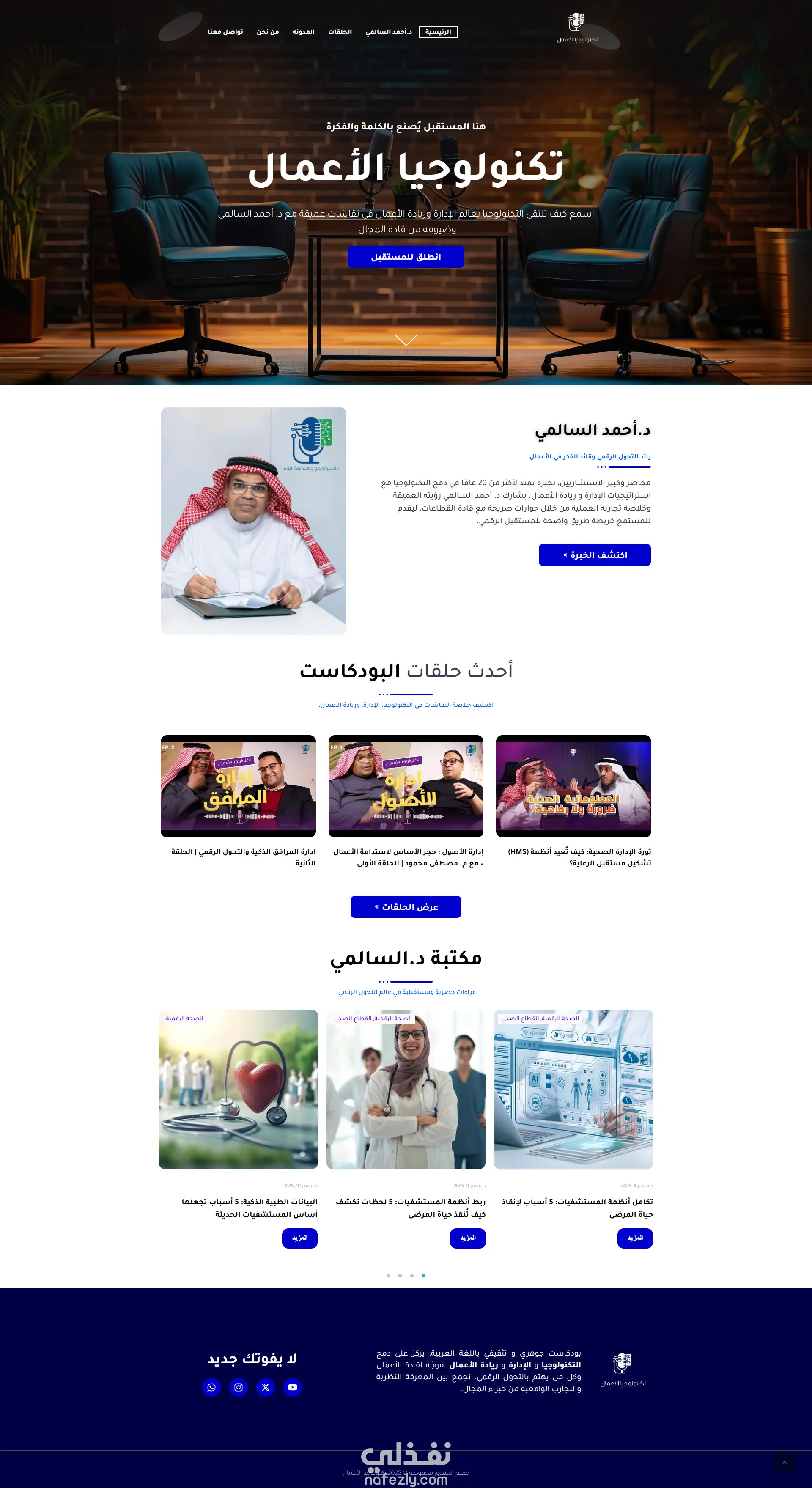 الهدف: بناء مركز رقمي لرواد الأعمال في السعودية يجمع بين طاقة المحتوى الصوتي والاحترافية في العمل. الدور التقني: قمت بهندسة واجهة المستخدم (UI/UX) لضمان سهولة التصفح بين الحلقات، مع تطوير الموقع باستخدام WordPress وElementor لضمان سرعة الأداء. النتيجة: منصة عصرية تدعم بناء مجتمع تفاعلي حول المحتوى.