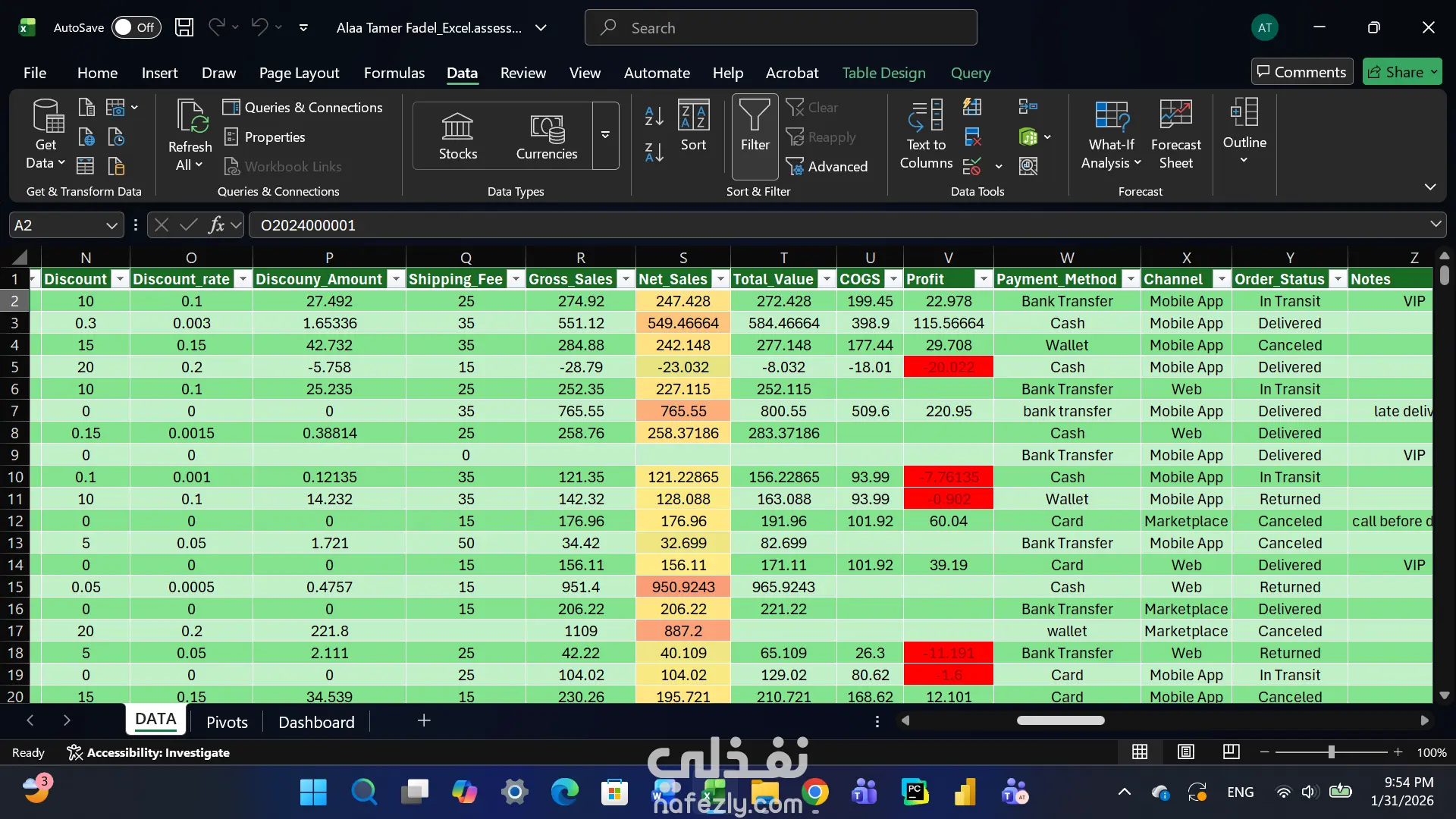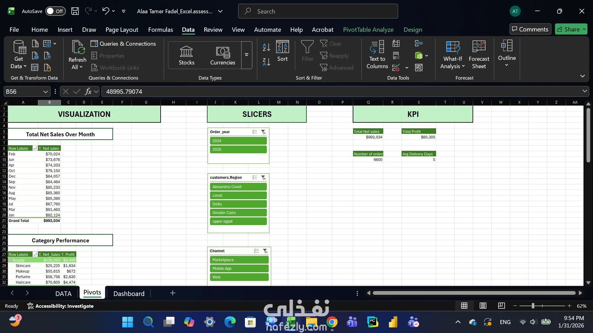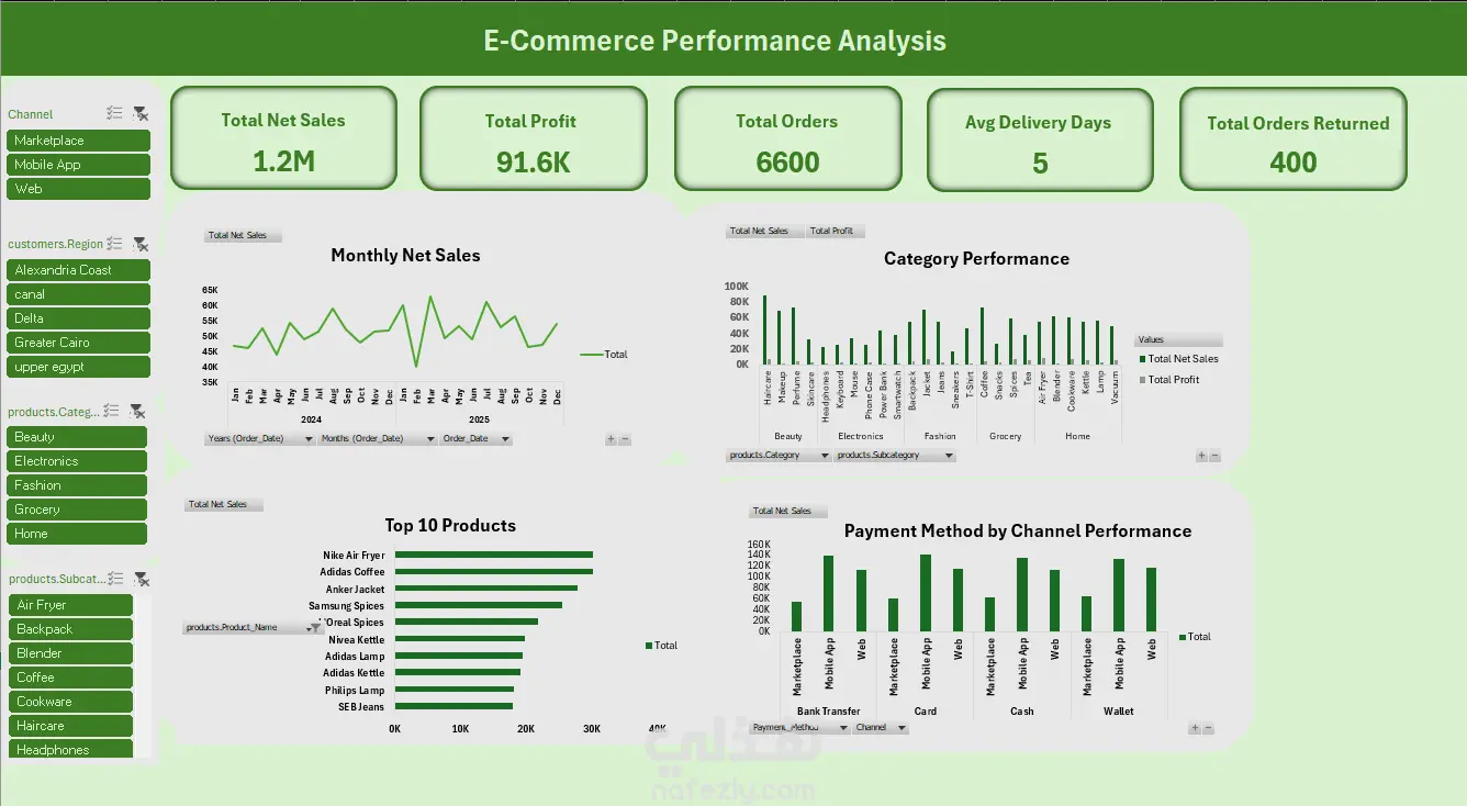 قمت بإنشاء Pivot Tables لاستخراج مؤشرات الأداء الرئيسية مثل صافي المبيعات، الأرباح، عدد الطلبات، نسبة المرتجعات ومتوسط أيام التوصيل، مع تصميم Dashboard تفاعلي يتيح تحليل البيانات بسهولة باستخدام الفلاتر (Slicers).