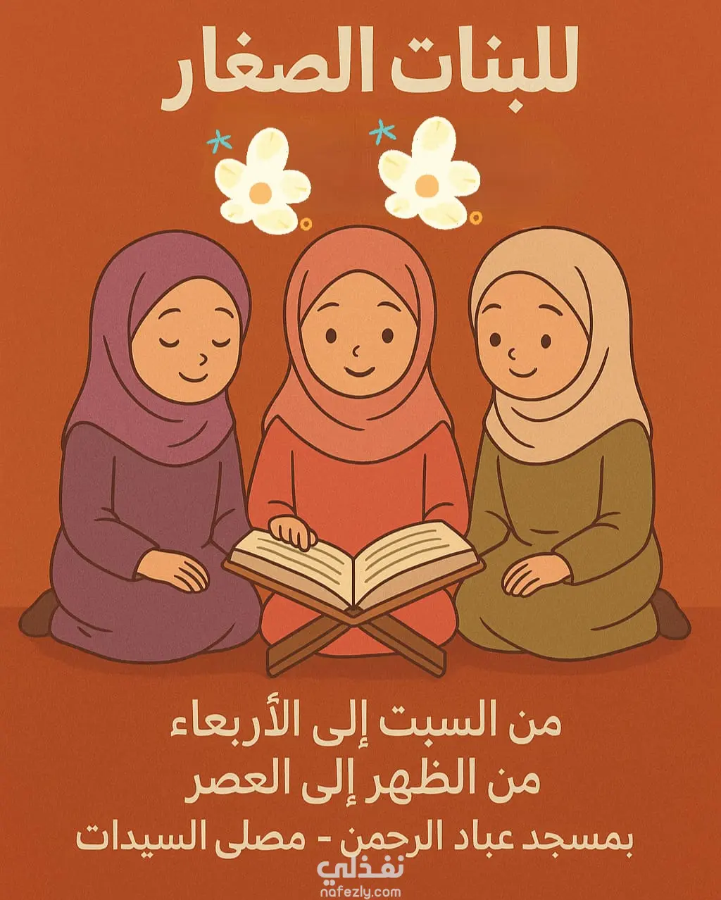 الإعلان عبارة عن تصميم بسيط وهادئ بطابع دافئ، بخلفية برتقالية مريحة. في المنتصف رسم كرتوني لطيف لثلاث فتيات صغيرات يرتدين الحجاب، جالسات معًا حول مصحف مفتوح على حامل، في أجواء تعبر عن التعلم والروحانية. فوقهن عناصر زخرفية بسيطة (زهور) تضيف لمسة طفولية جميلة. في أعلى الإعلان مكتوب: "للبنات الصغار" بشكل واضح وجذاب. وفي الأسفل تفاصيل النشاط: من السبت إلى الأربعاء من الظهر إلى العصر بمسجد عباد الرحمن – مصلى السيدات التصميم يوصل فكرة حلقة تعليم قرآن مخصصة للبنات الصغيرات بأسلوب بسيط، ودي، ومناسب للأطفال، مع ألوان مريحة ورسومات قريبة من عالمهم.