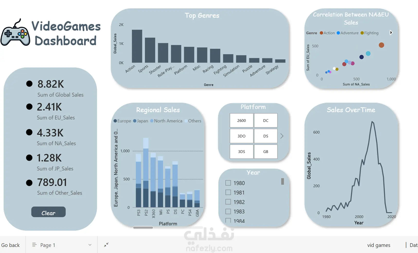 هو عبارة عن تقرير تفاعلي لمبيعات ال video games حول العالم و يعرض الرسوم البيانية المؤثرة في اسعار و مبيعات ال video games تم تحليل البيانات و تنظيفها باستخدام python و تم عمل الداش بورد و الرسومات باستخدام power bi