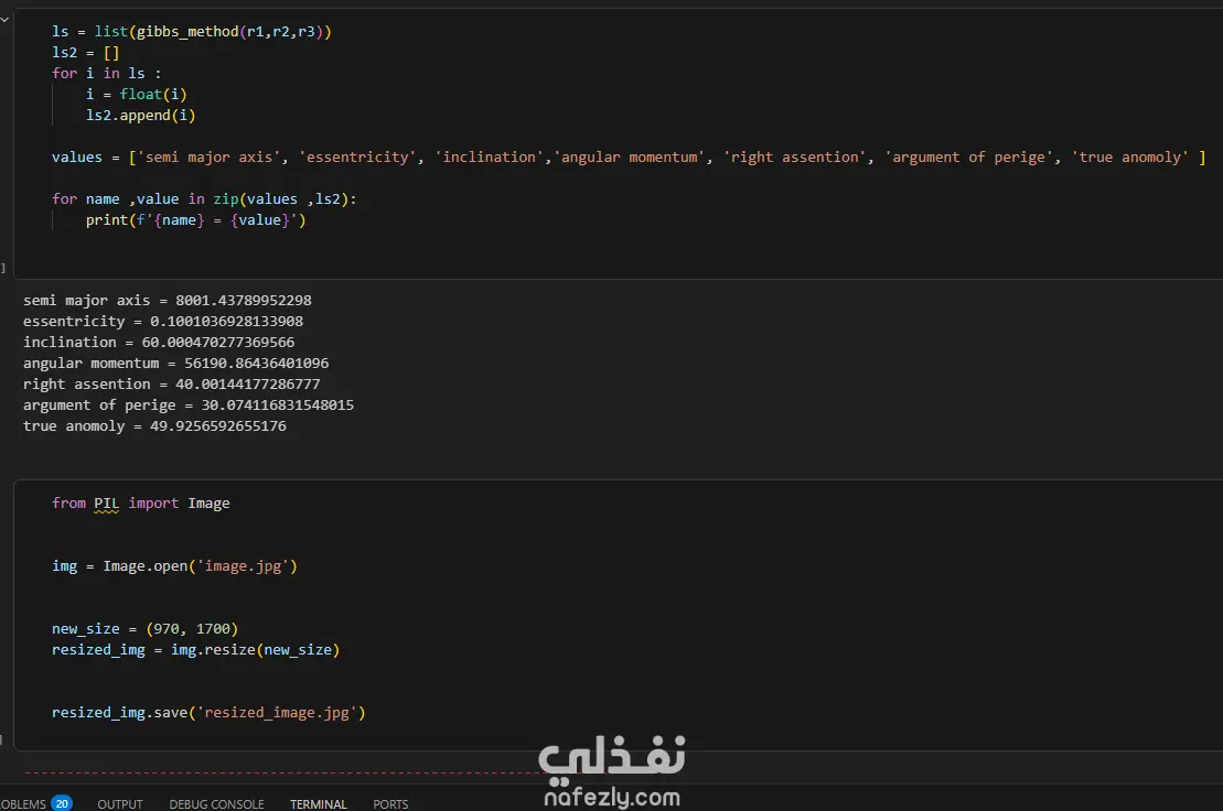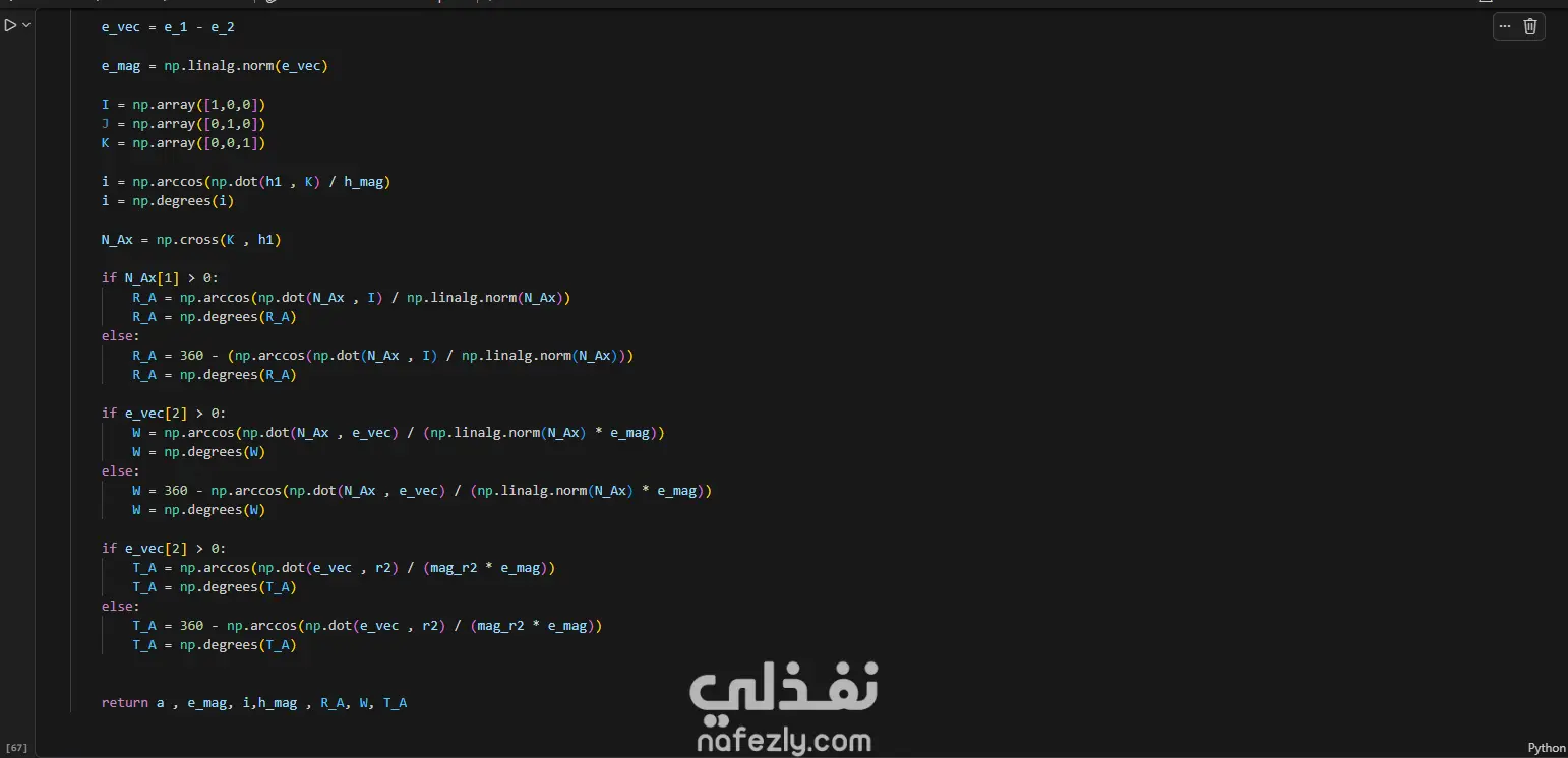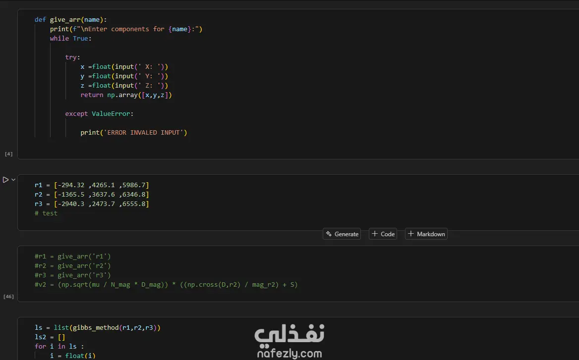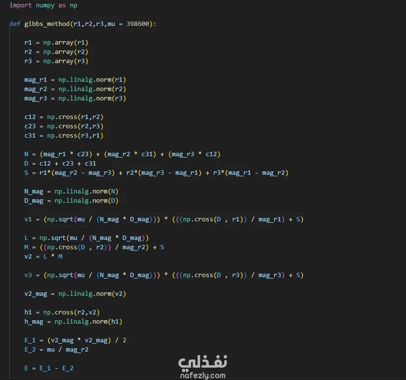 هذا الاسكربت يقوم بتحديد العناصر الست الاساسية للمدار في الفضاء بدقة عالية عن طريق gibbs method و هي طريقة لتحديد العناصر الست للمدار (semi-major axis , eccentricity , inclination , right ascension of the ascending node argument of periapsis , true anomaly) عن طريق معرفت ثلاثة من متجهات الاذاحة للمدار فعند تحديد المتجهات يتم تحديد اي متجه سرعة في المدار للمتجه المحدد (في الاسكريبت تم الاعتماد علي المتجه الثاني) ثم عن طريق بعض المعادلات الرياضية يتم تحديد العناصر الست