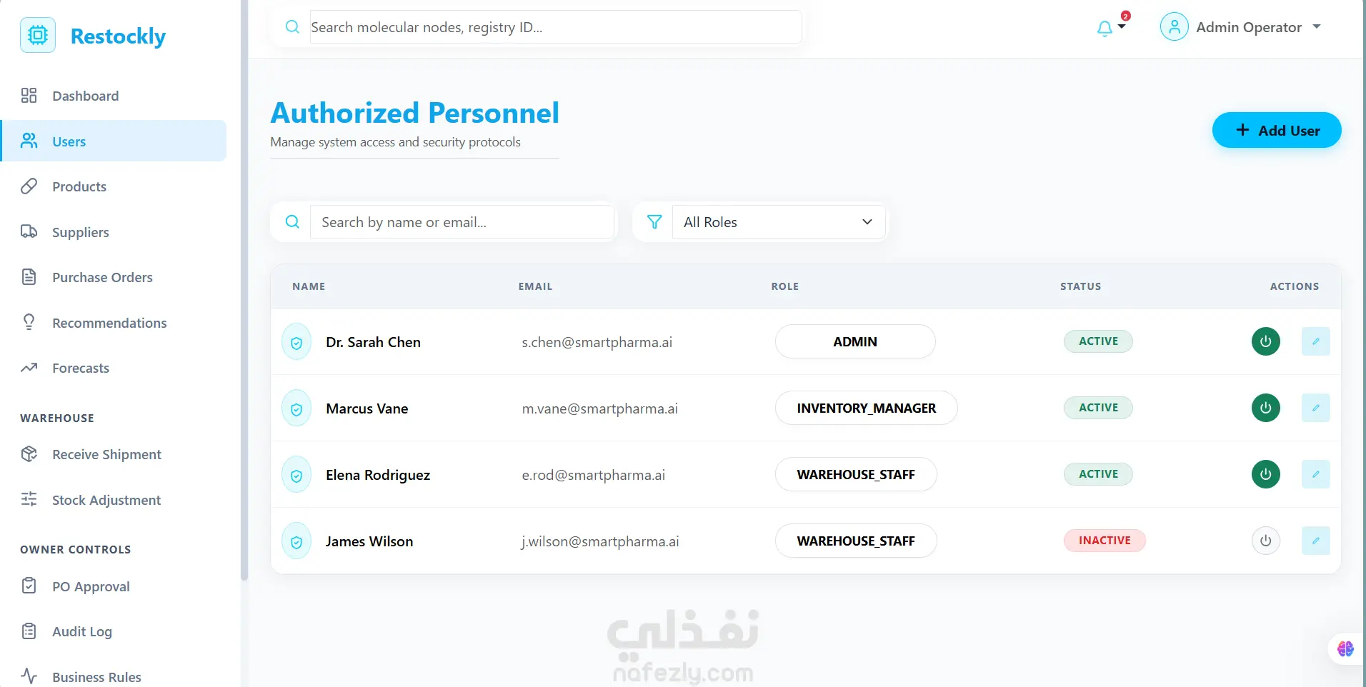 توفر الواجهة تصورات بيانات متقدمة تشمل المخططات البيانية، ومؤشرات الأداء الرئيسية (KPIs)، والتنبيهات، والتحليلات التفصيلية، من خلال واجهات نظيفة تعتمد على نظام الأدوار لتلبية احتياجات المستخدمين مثل مديري النظام، ومديري المخزون، وموظفي المخازن، ومديري المشتريات.