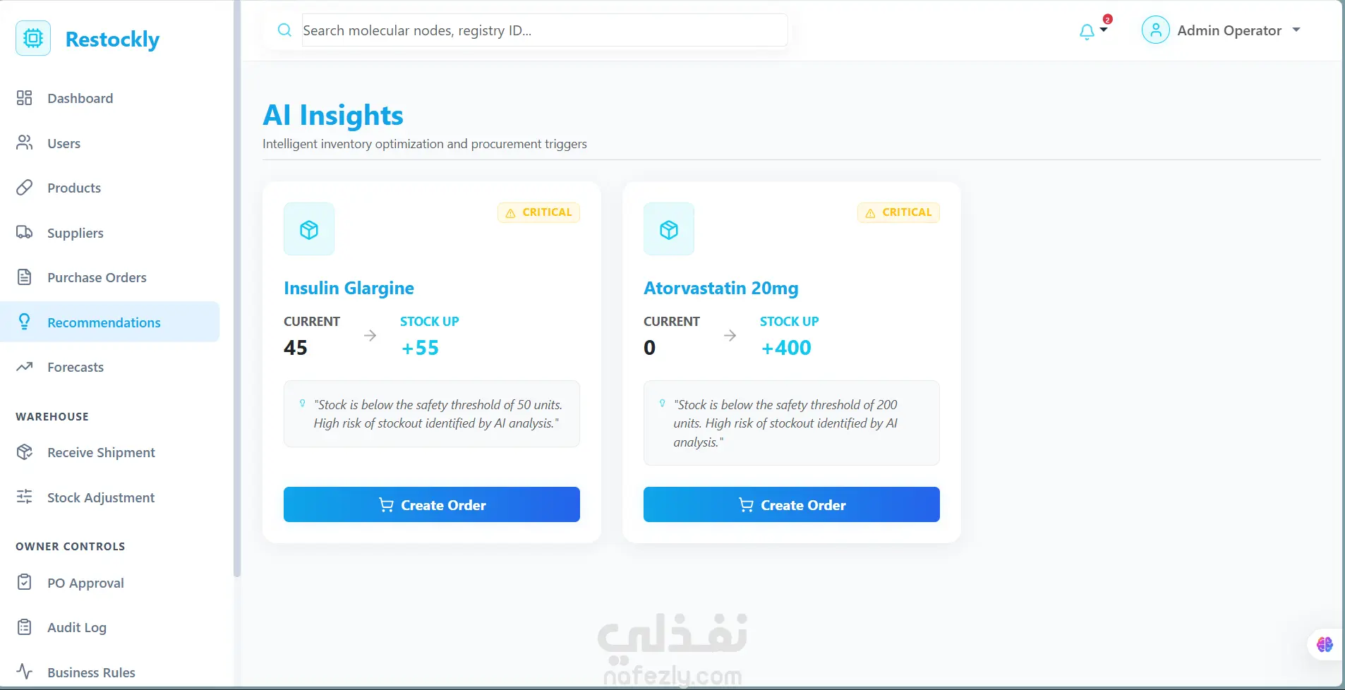 يضم التطبيق مجموعة متكاملة من الوحدات التفاعلية مثل تتبع المخزون في الوقت الحقيقي، ولوحات تحكم للتنبؤ بالطلب باستخدام الذكاء الاصطناعي، وإدارة الخصومات الذكية وتواريخ انتهاء الصلاحية، بالإضافة إلى تصور تنظيم المخازن وإدارة الموردين وأنظمة إعادة التوريد التلقائي.