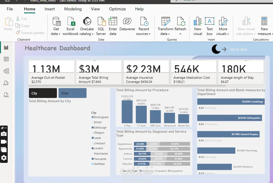 قمت بتصميم Dashboard لتحليل بيانات القطاع الصحي (Healthcare Dashboard) بهدف عرض أهم المؤشرات بشكل واضح وسهل الفهم لدعم اتخاذ القرار.