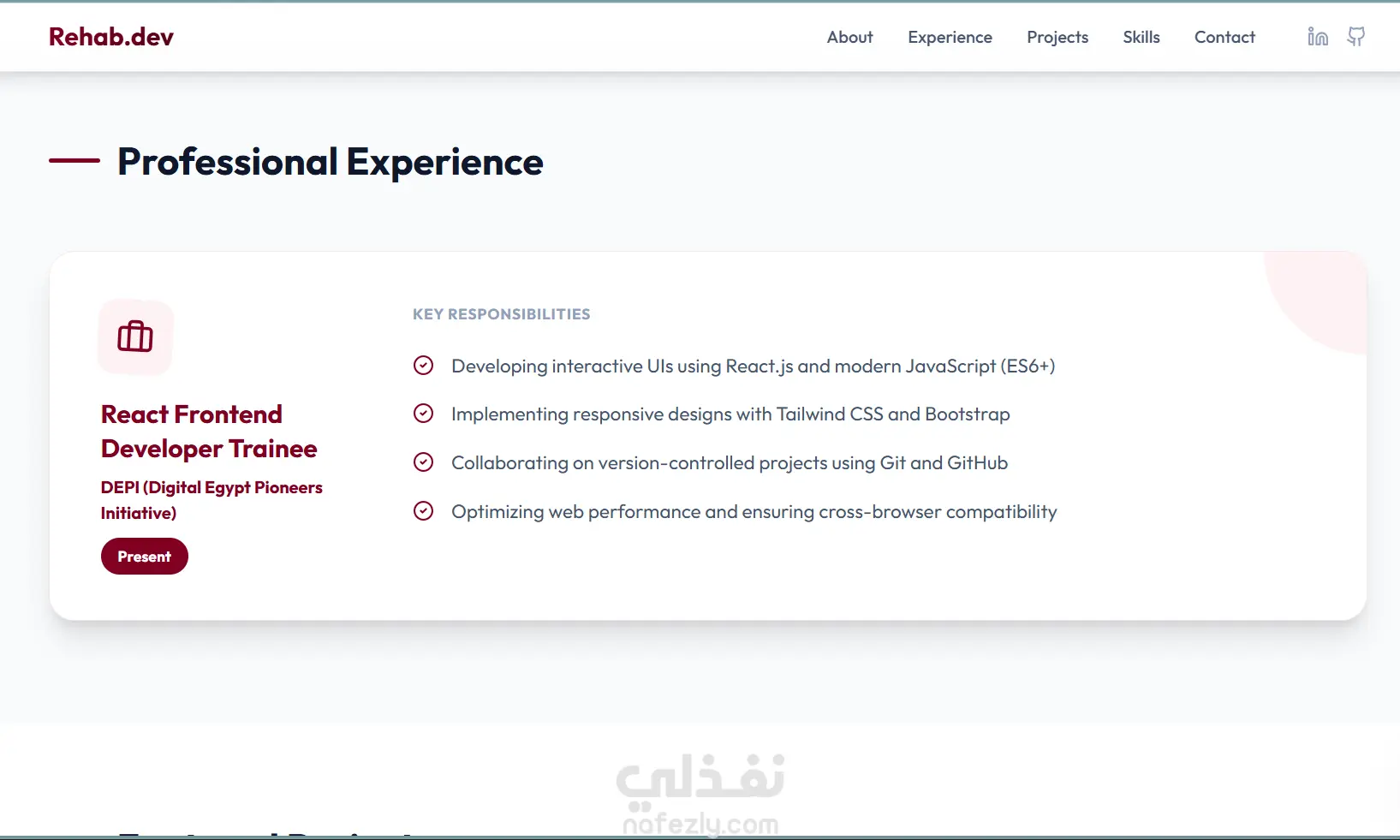 يحتوي البورتفوليو على أقسام مخصصة مثل: حول، الخبرة المهنية، المشاريع المميزة، المهارات والخبرات، ونموذج تواصل فعال — جميعها مبنية باستخدام HTML5 و CSS3 و JavaScript (ES6+). تمت إدارة النسخ والتحكم فيها باستخدام Git و GitHub، وتم نشر الموقع على Vercel لضمان التوصيل المستمر والتوافر العالمي.