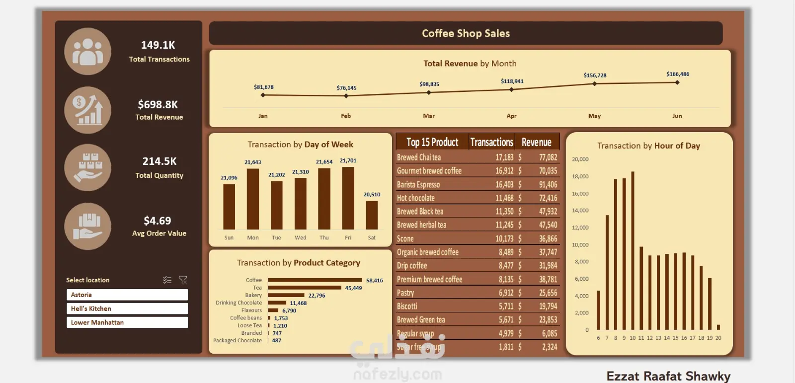 لوحة تحكم احترافية تم تصميمها باستخدام Microsoft Excel لعرض وتحليل أداء مبيعات كوفي شوب بشكل شامل وسهل الفهم.