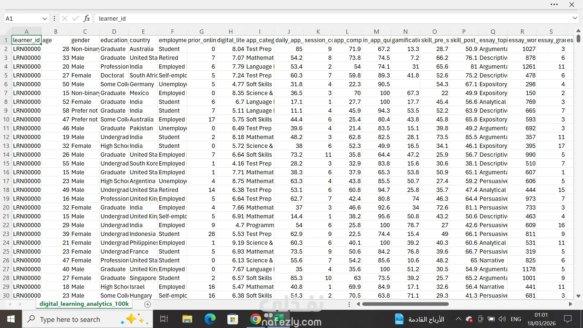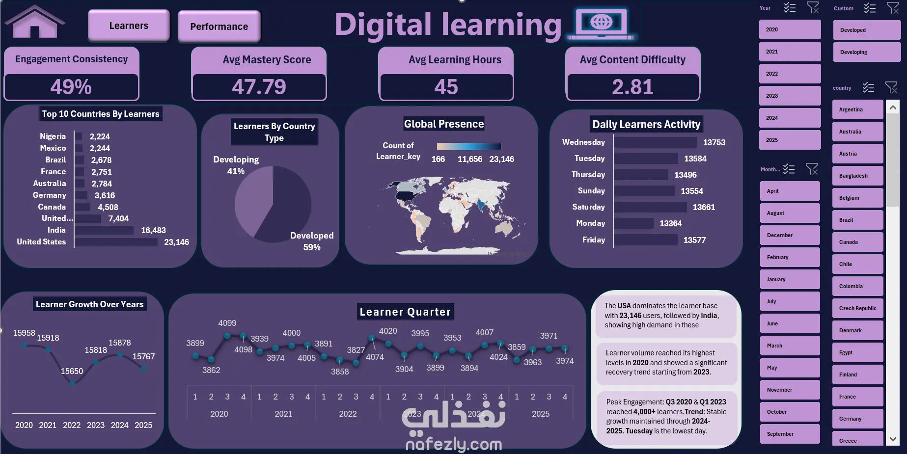 مشروع تحليل بيانات شامل يهدف إلى استخراج رؤى استراتيجية من قاعدة بيانات ضخمة تضم حوالي 95,000 متعلم. يركز المشروع على فهم سلوك المستخدمين وتفاعلاتهم مع المنصات التعليمية الرقمية لتحسين تجربة التعلم واتخاذ قرارات مبنية على البيانات. الدور والمهام (Key Responsibilities): نمذجة البيانات (Data Modeling): بناء وتصميم نموذج بيانات متطور باستخدام نظام Star Schema لضمان سرعة وكفاءة التقارير. تحليل البيانات الضخمة: التعامل مع قاعدة بيانات كبيرة واستخدام تقنيات التحليل المتقدمة لاستخراج المؤشرات الرئيسية. تصميم لوحات القيادة (Dashboards): إنشاء لوحات تفاعلية باستخدام Excel و Power Query لعرض اتجاهات التعلم ونسب الإنجاز. استخراج الرؤى (Insights): كتابة ملخص تنفيذي (Executive Summary) يوضح نقاط القوة والفرص المتاحة بناءً على الأرقام المستخرجة.