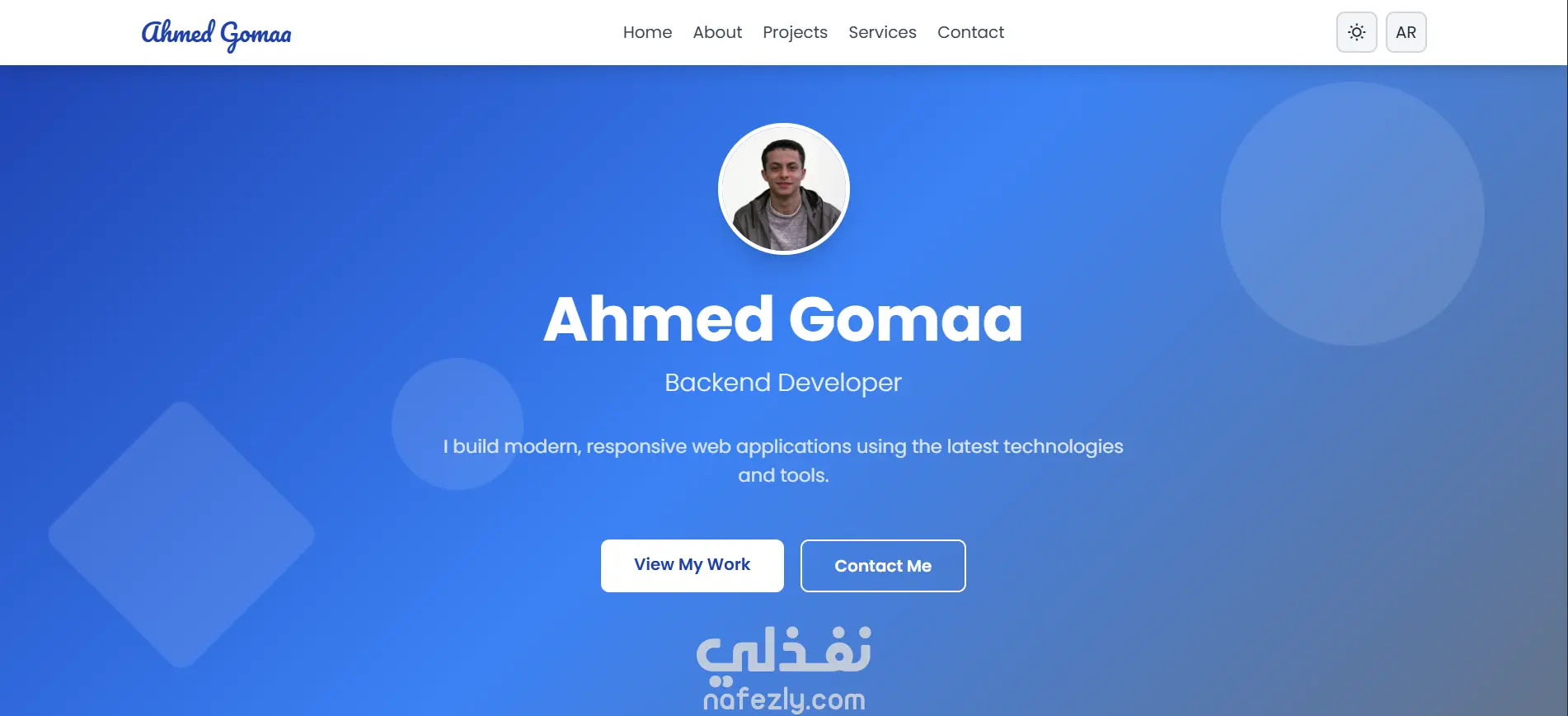 - قسم تعريفي يعرض نبذة عن المطوّر وصورته ومهاراته التقنية.