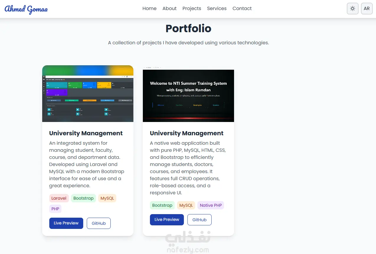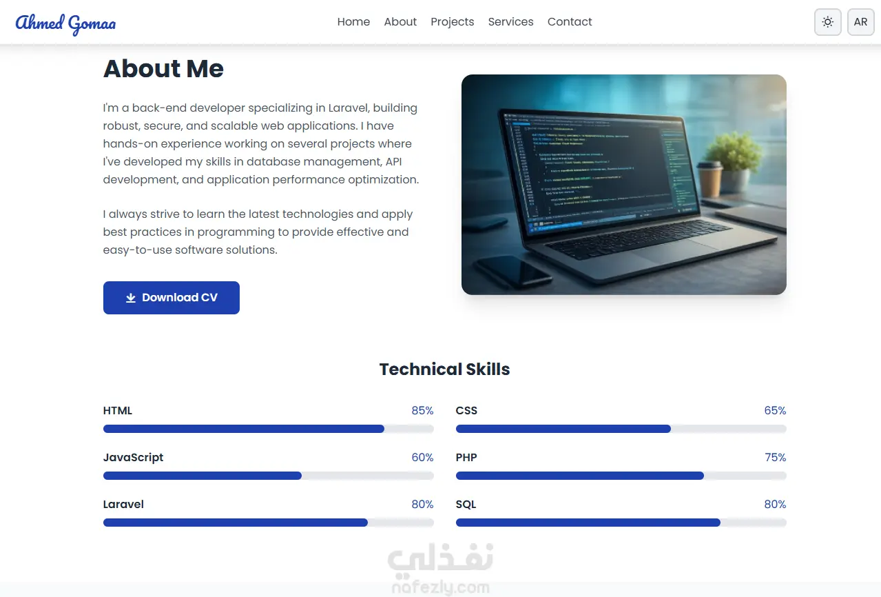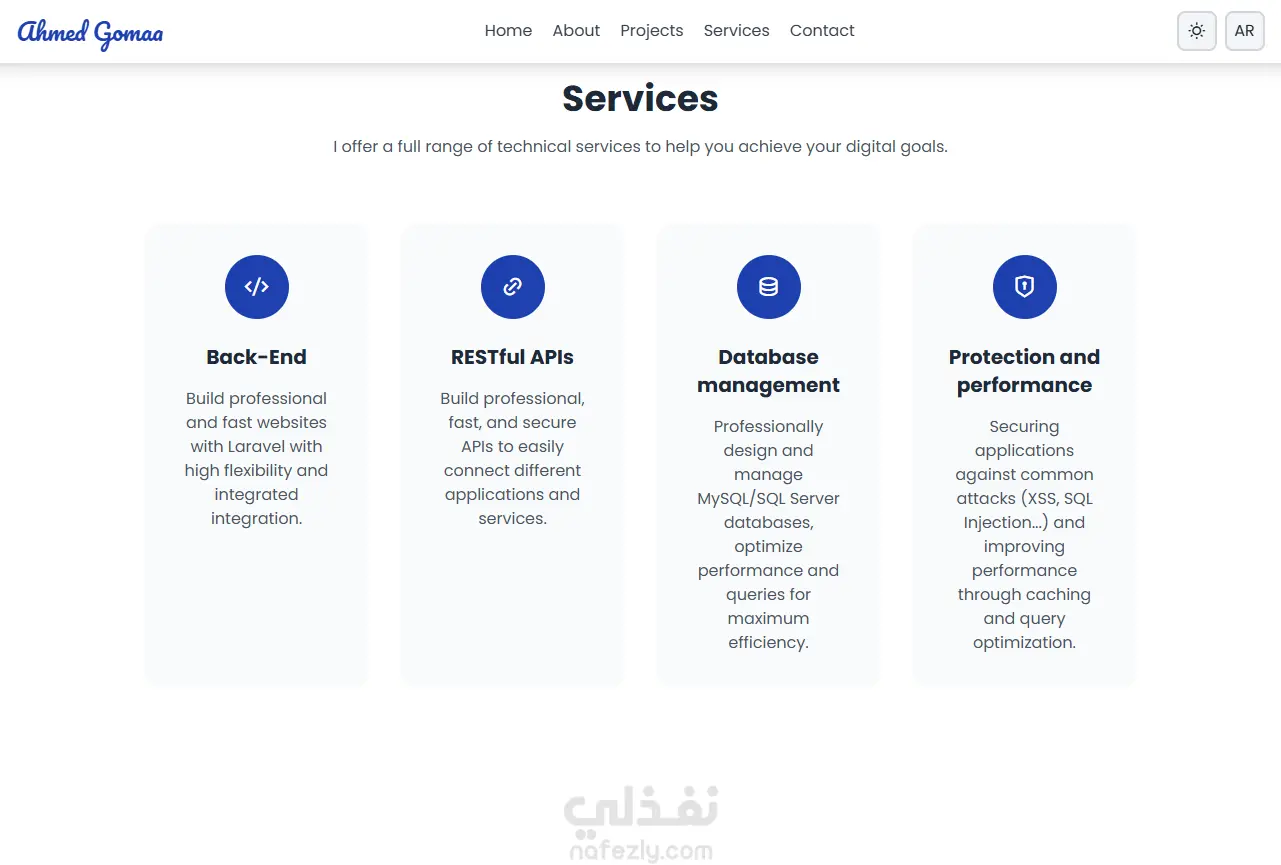- قسم للخدمات يعرض مجالات العمل التي يقدمها المطوّر مثل تطوير RESTful APIs، تطوير واجهات باستخدام Laravel، إدارة قواعد البيانات، وتصميم الواجهات.