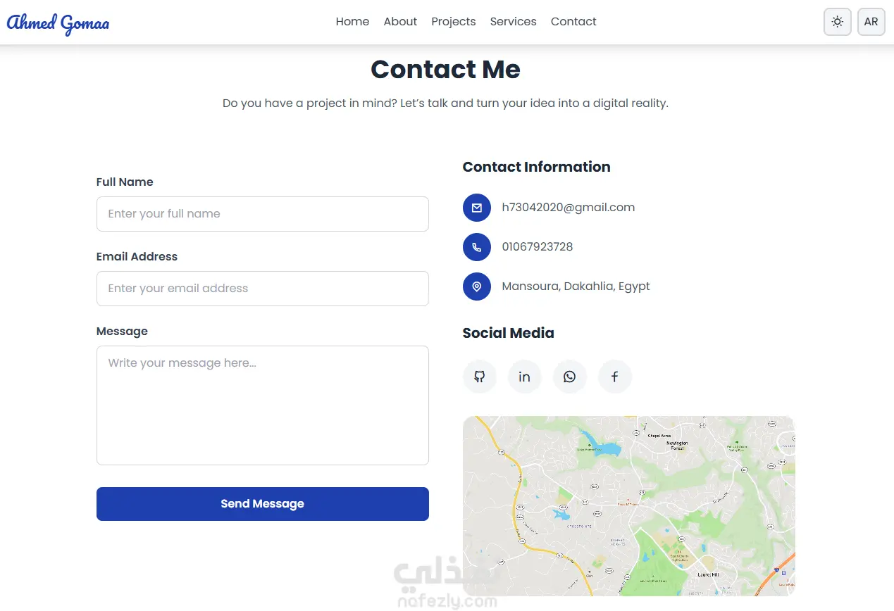 - نموذج تواصل مباشر مع إرسال الرسائل عبر البريد الإلكتروني.